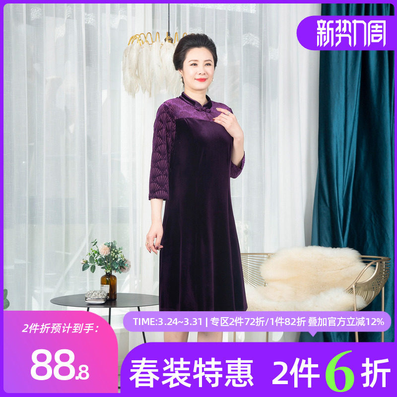依佈中老年女士连衣裙2026春装新款丝绒礼服裙妈妈装高腰显瘦裙子
