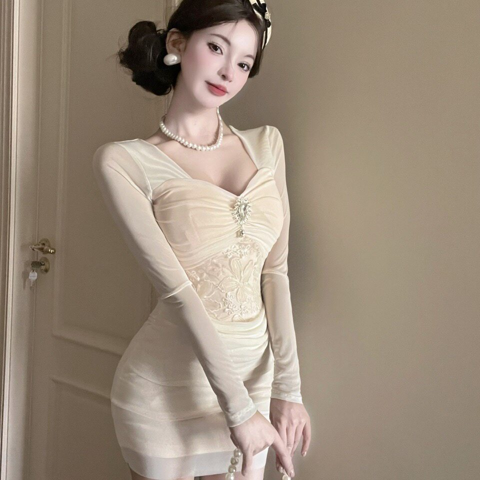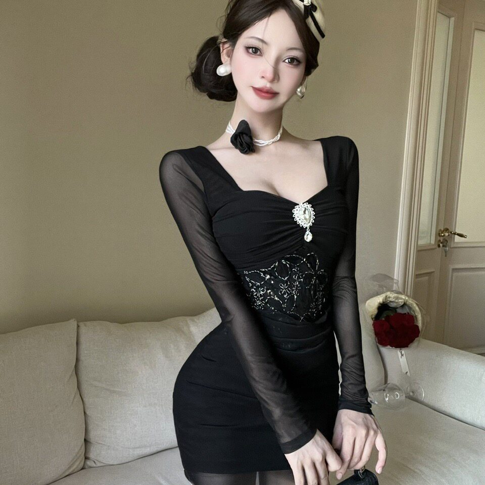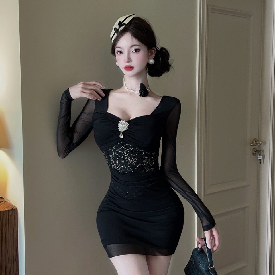 春装150cm155小个子显高XXXS女装网纱短款长袖收腰包臀紧身连衣裙