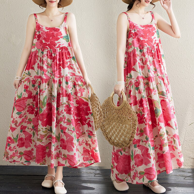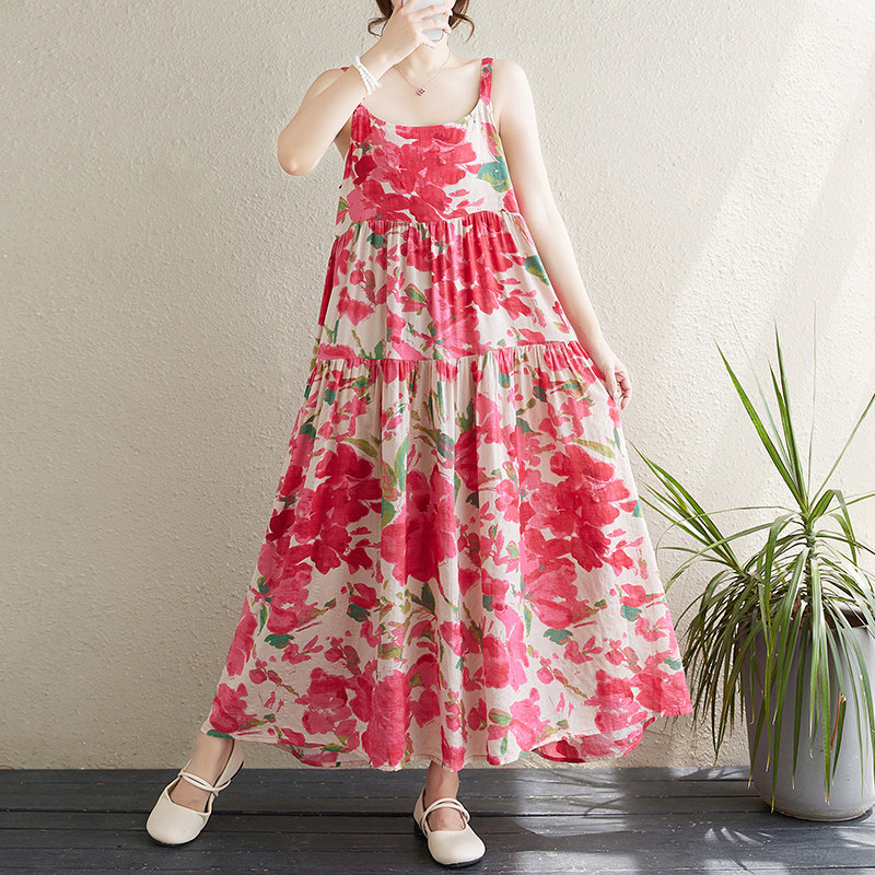 夏季新款棉麻印花薄款拼接长裙连衣裙吊带显瘦大摆蛋糕裙红色花