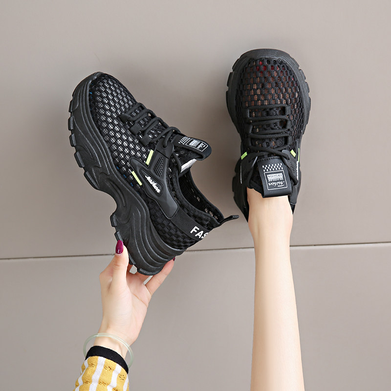 透气黑色运动鞋女夏季镂空薄款厚底老爹鞋34码不累脚防滑工作网鞋
