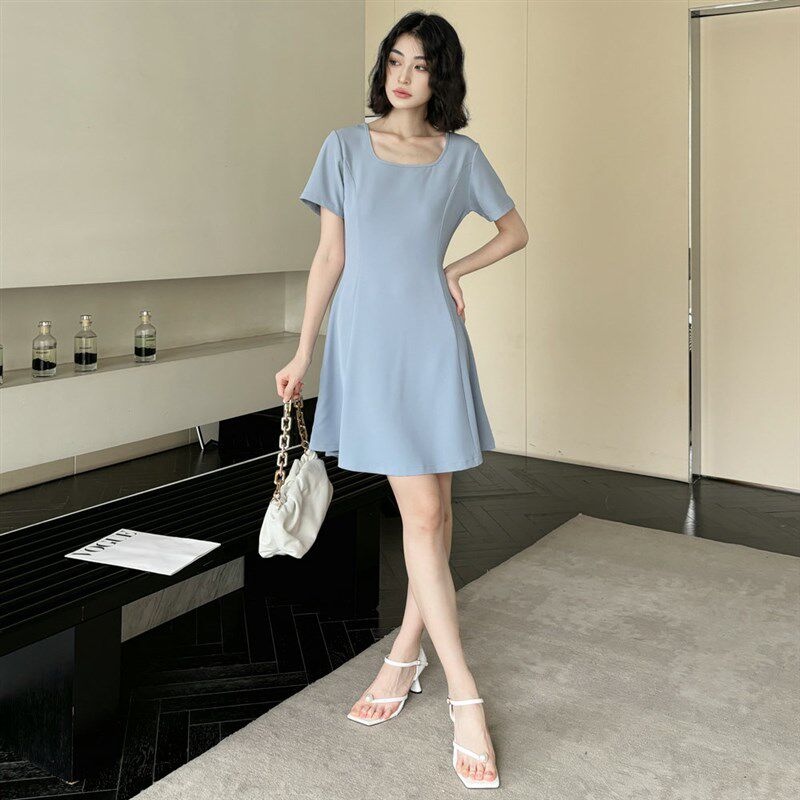 显白浅蓝色方领短袖收腰A字连衣裙中长款夏季显瘦垂坠女纯色短款