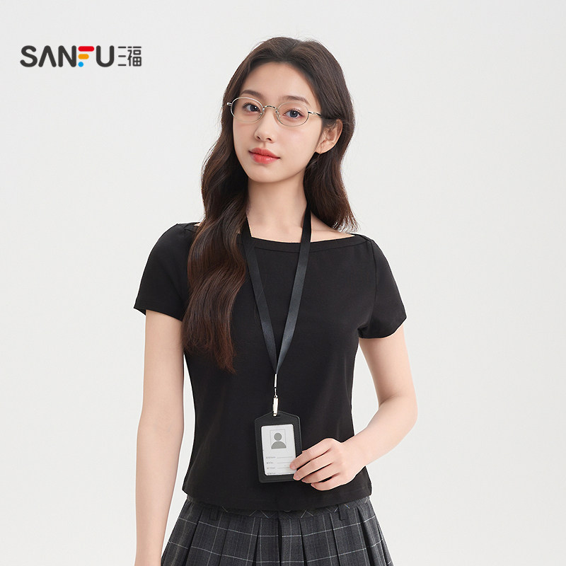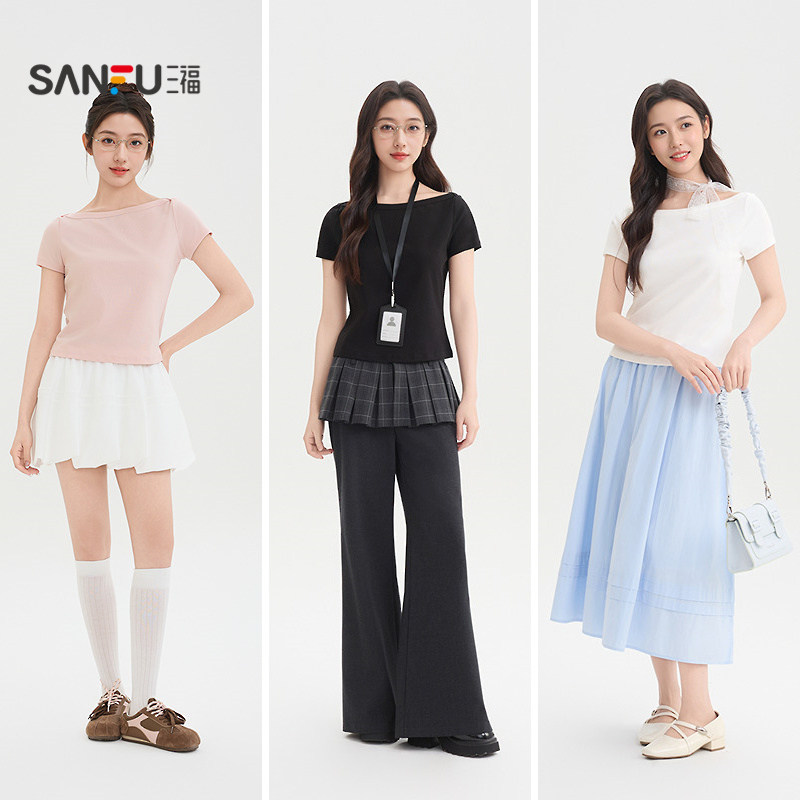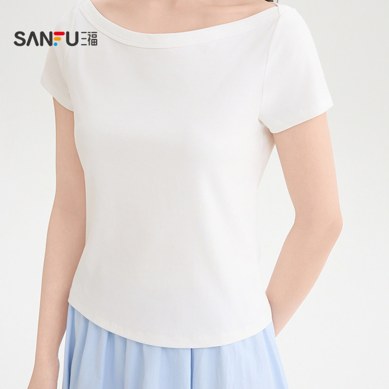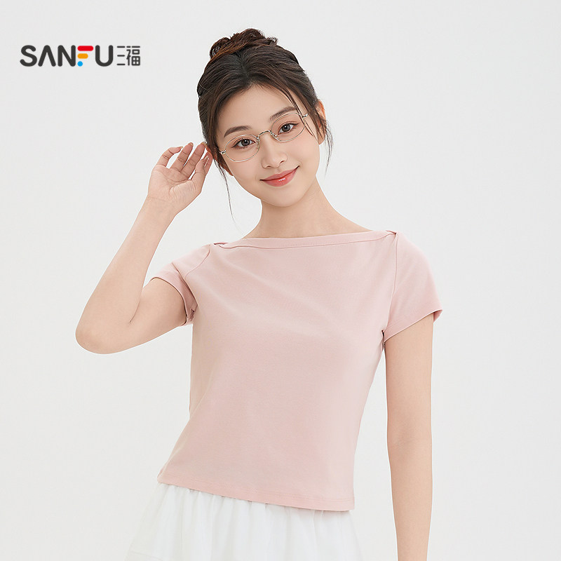 三福纯色短袖2026新款夏季简约船领小个子短款t恤上衣女装517846