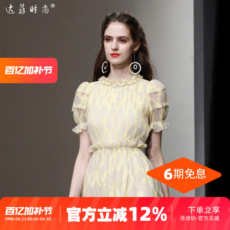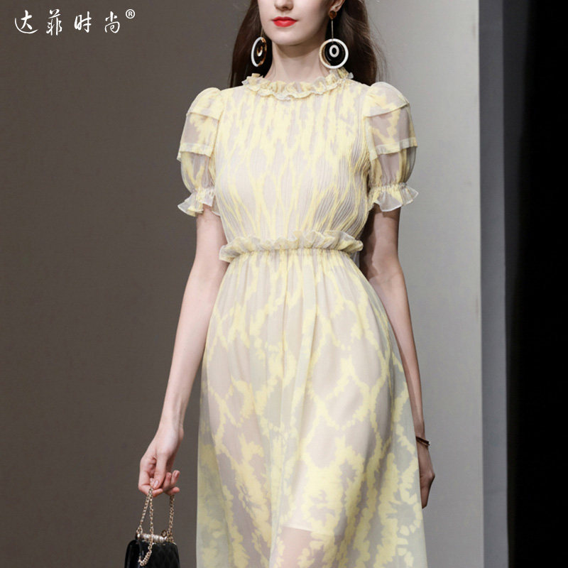 夏季女装2026新款气质黄色灯笼袖收腰显瘦纱裙连衣裙长裙女
