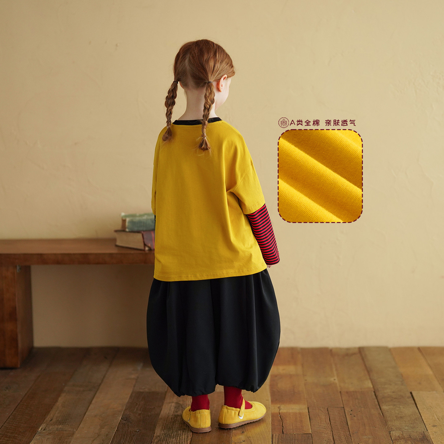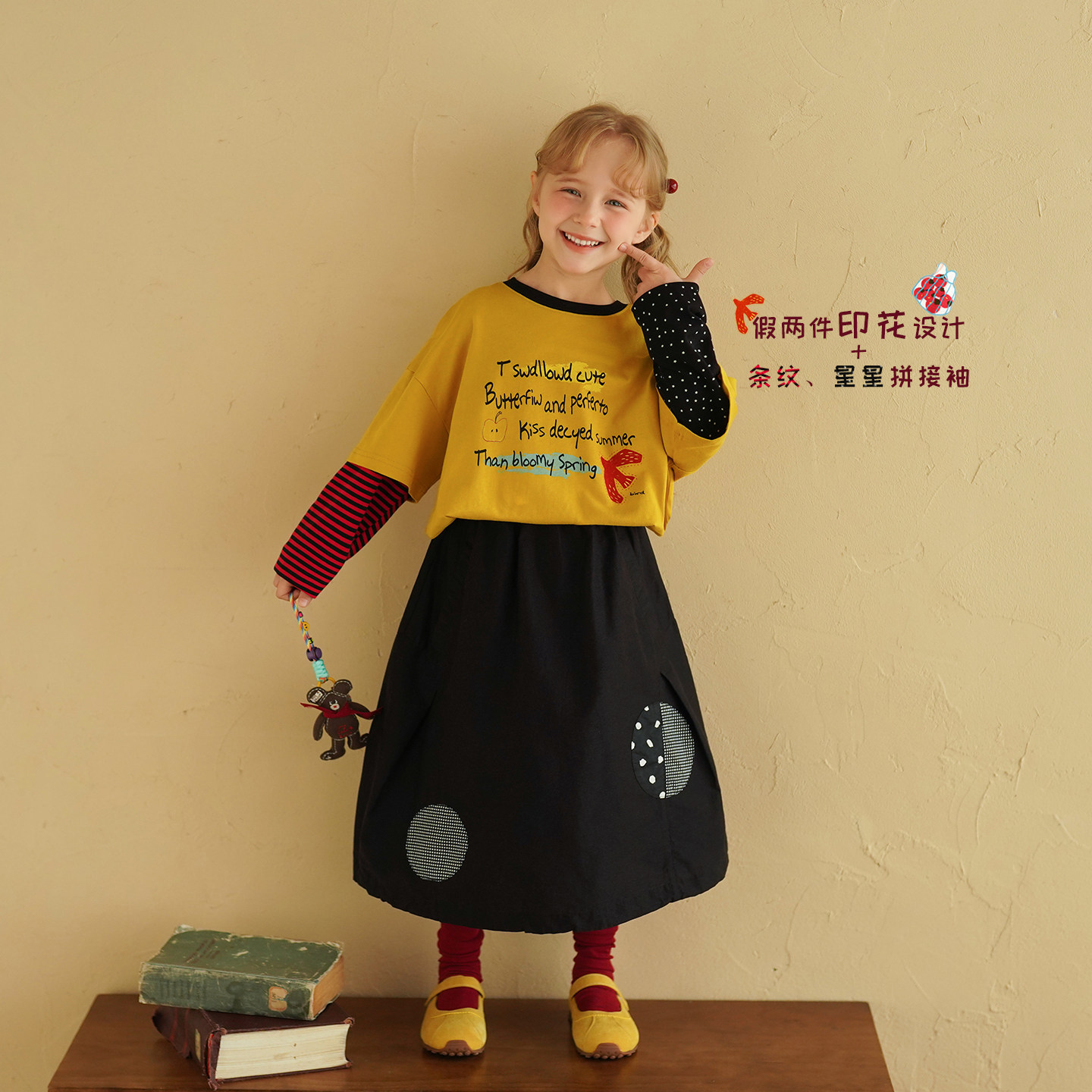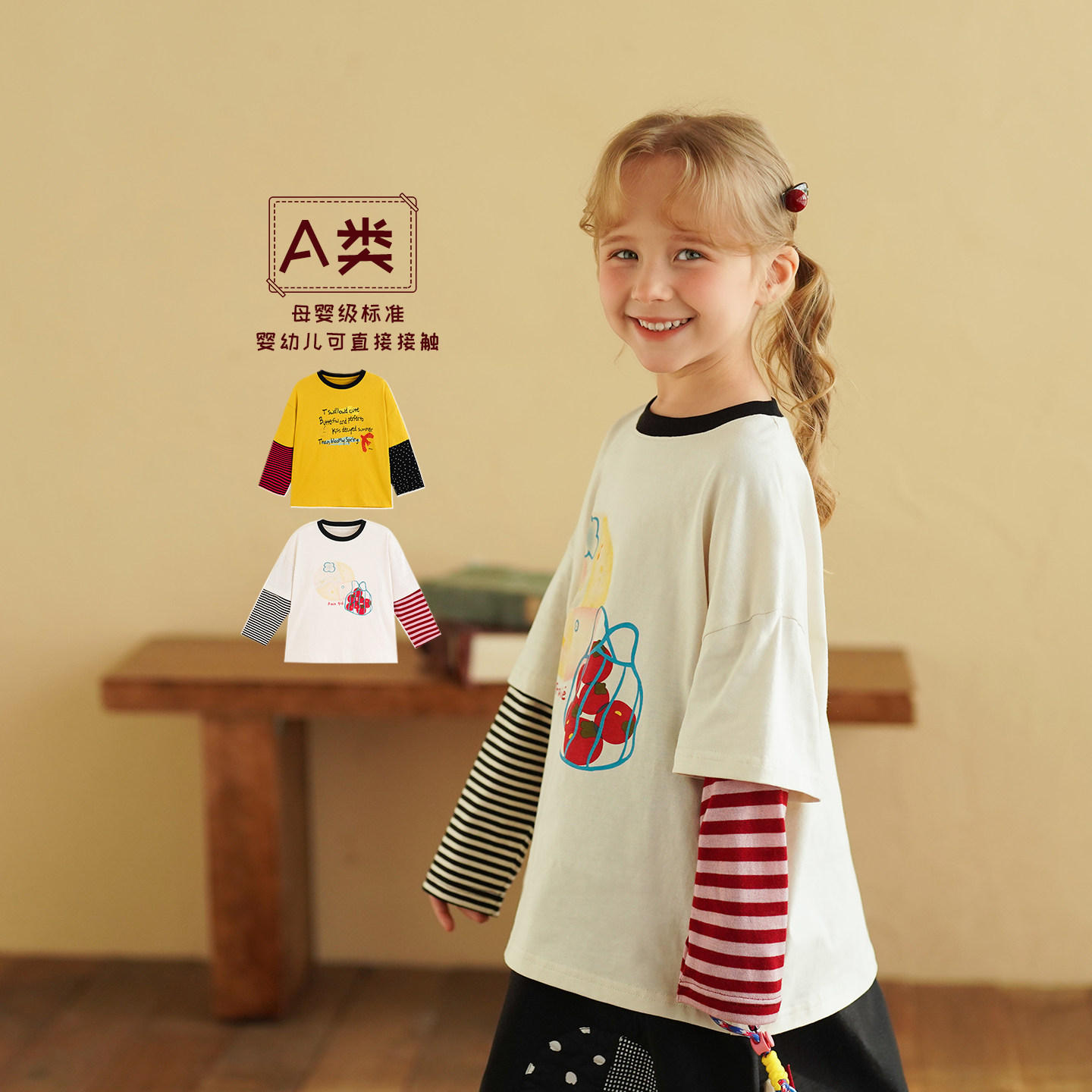 砚台家女童T恤长袖薄款2026春季新款儿童洋气印花拼色假两件上衣