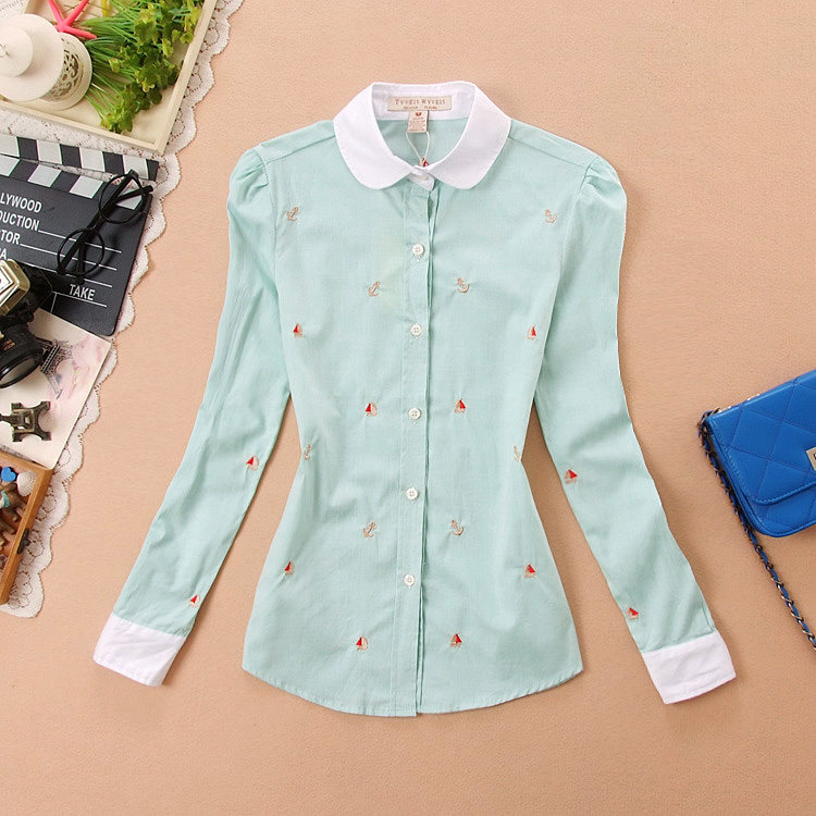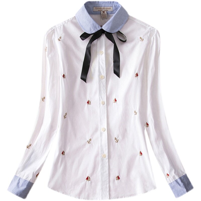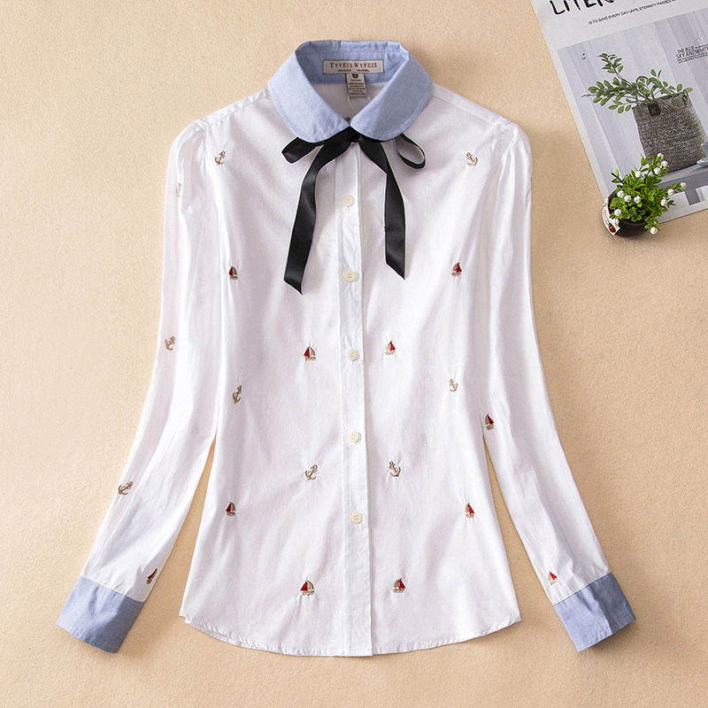 春季新款少女装学生长袖衬衣纯色衬衫打底上衣白色刺绣百搭初中