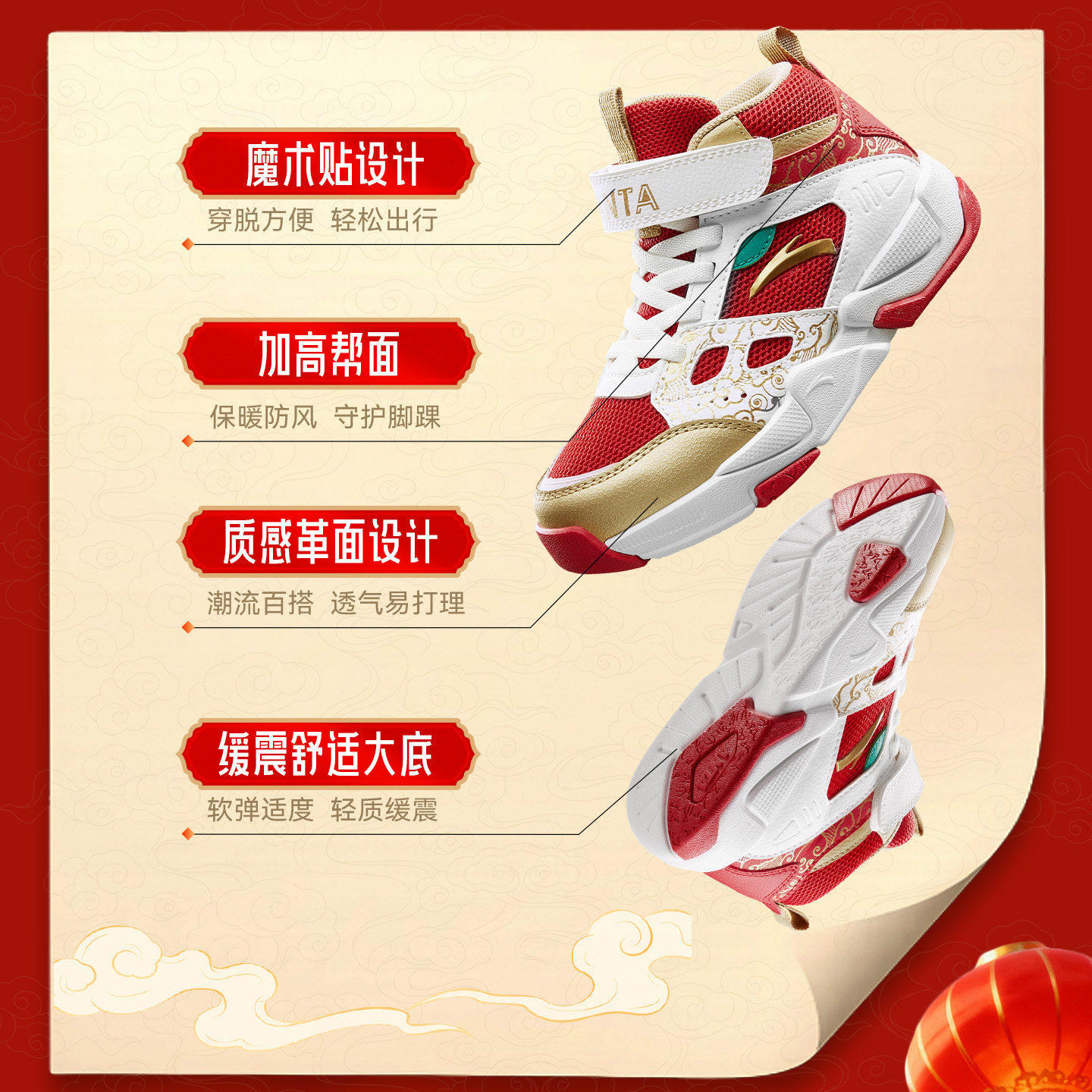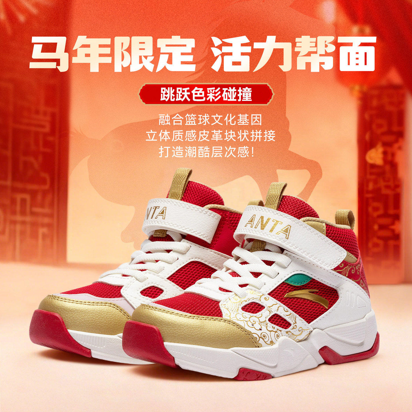 马年限定|安踏儿童篮球鞋2026新年红色款防滑耐磨魔术贴运动板鞋