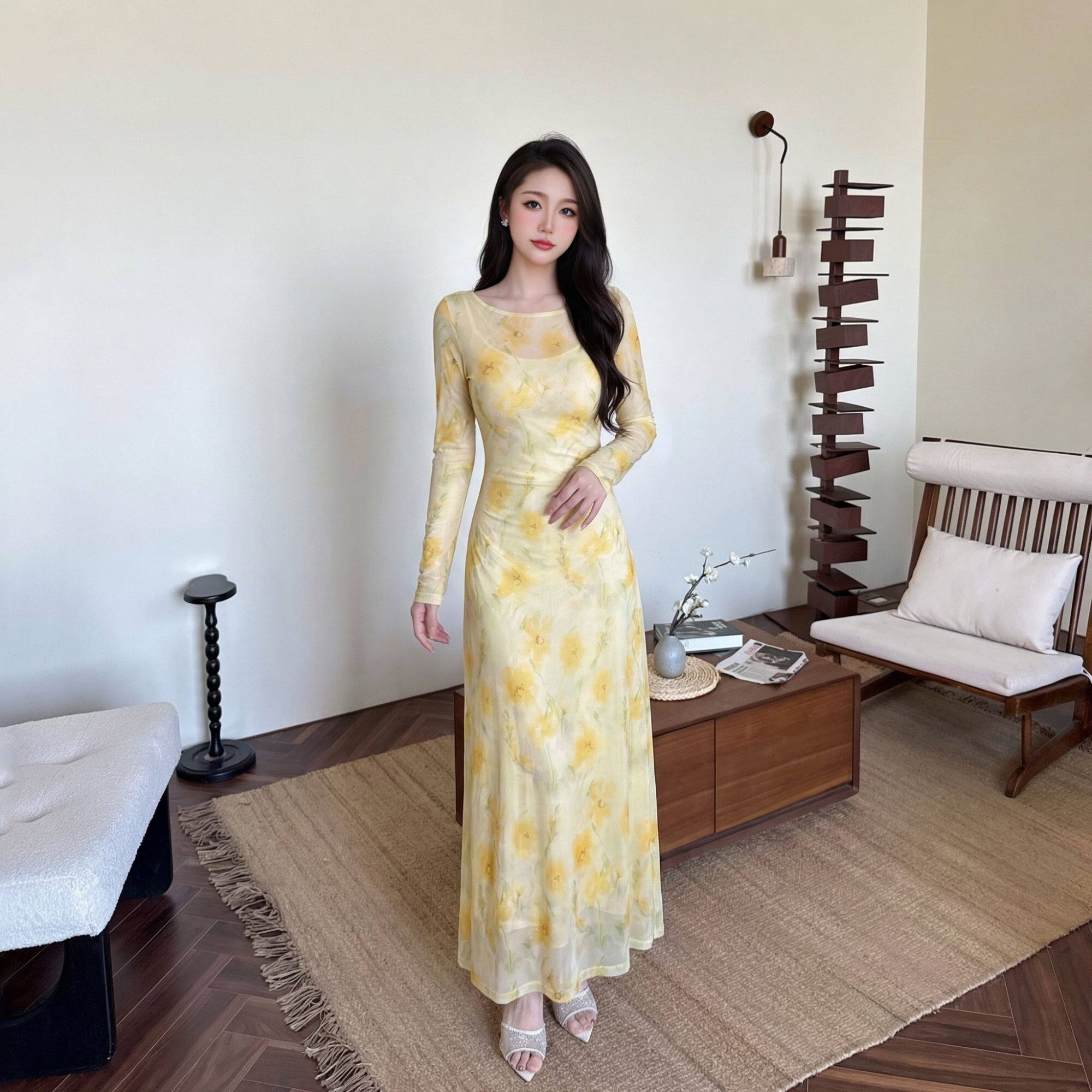 2026春季长袖气质印花常规长款高弹力长裙印花修身连衣裙碎花413