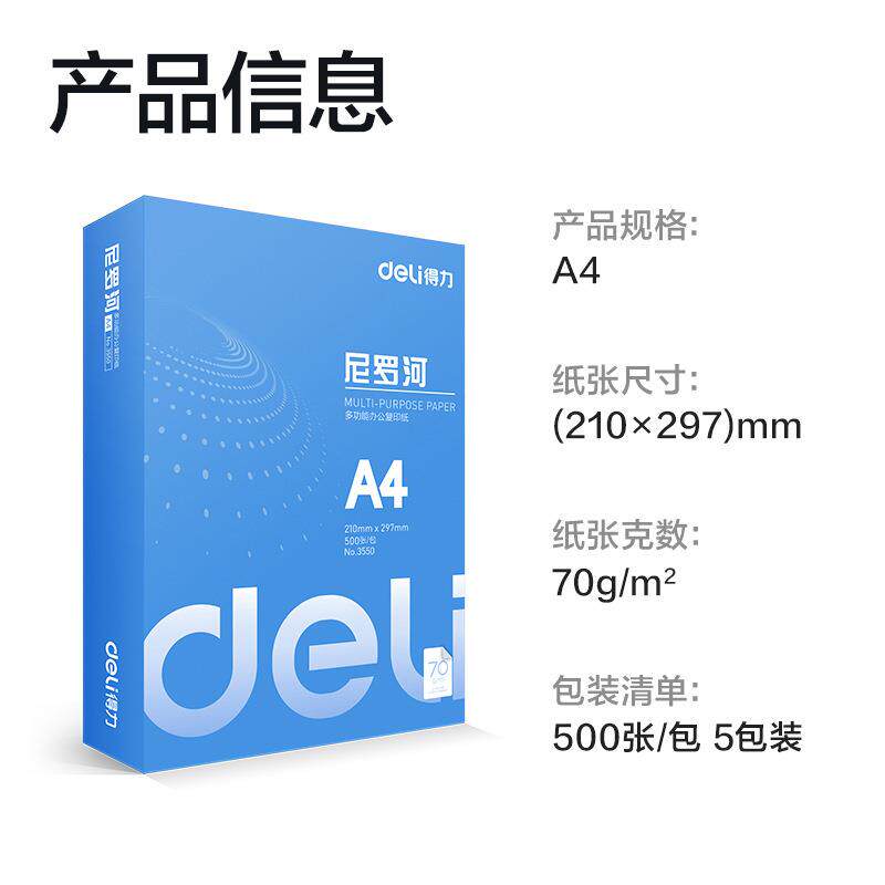 得力ZF3554尼罗河复印纸70g打印纸办公A4纸双面白纸草稿1包500张