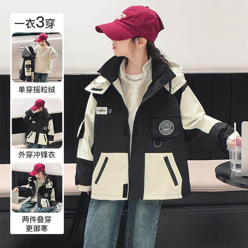 女大童冲锋衣秋冬装2025新款初中生外套女孩夹棉加厚三合一可拆卸