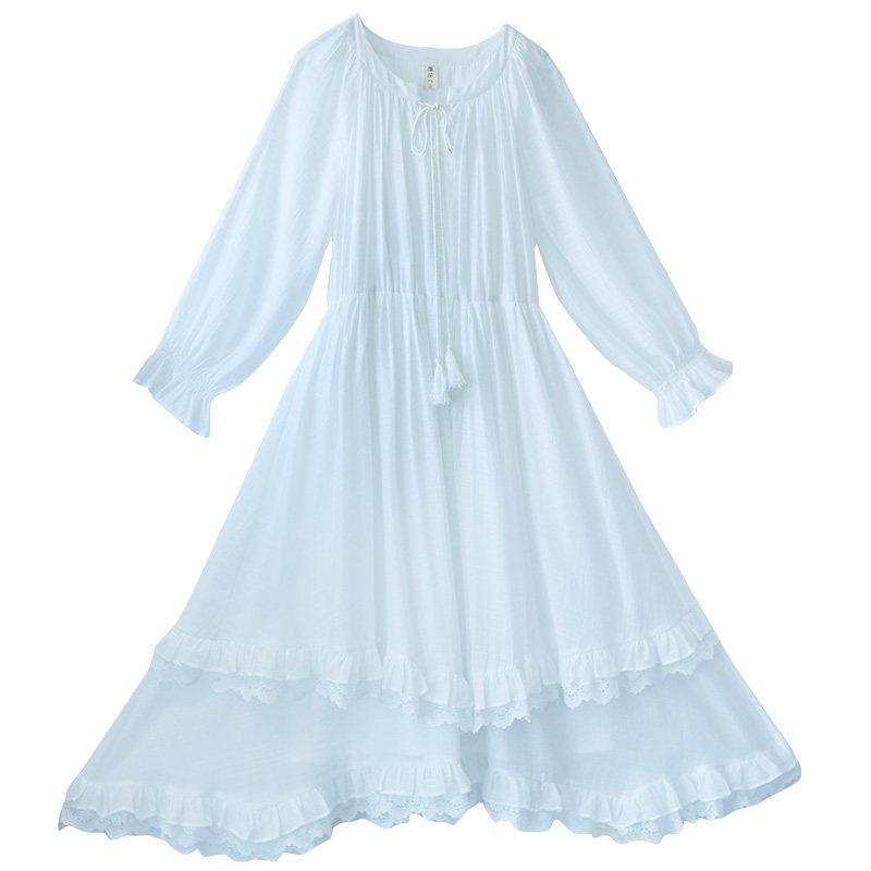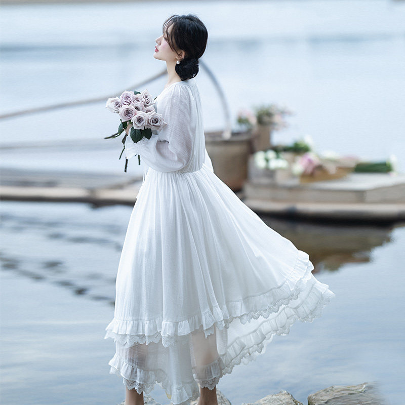 【皎洁月羽】圆领白色连衣裙女2025春季不规则蕾丝花边仙气长裙