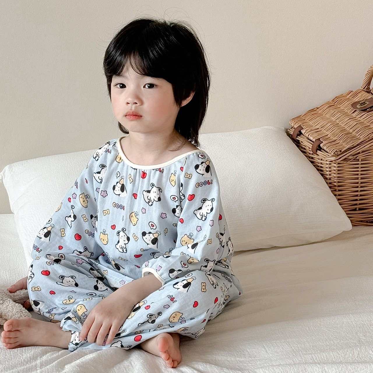 韩国女童夏季五分袖长裤套装纱布纯棉薄款家居服男童宽松萌趣睡衣