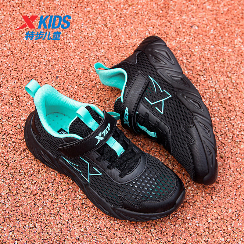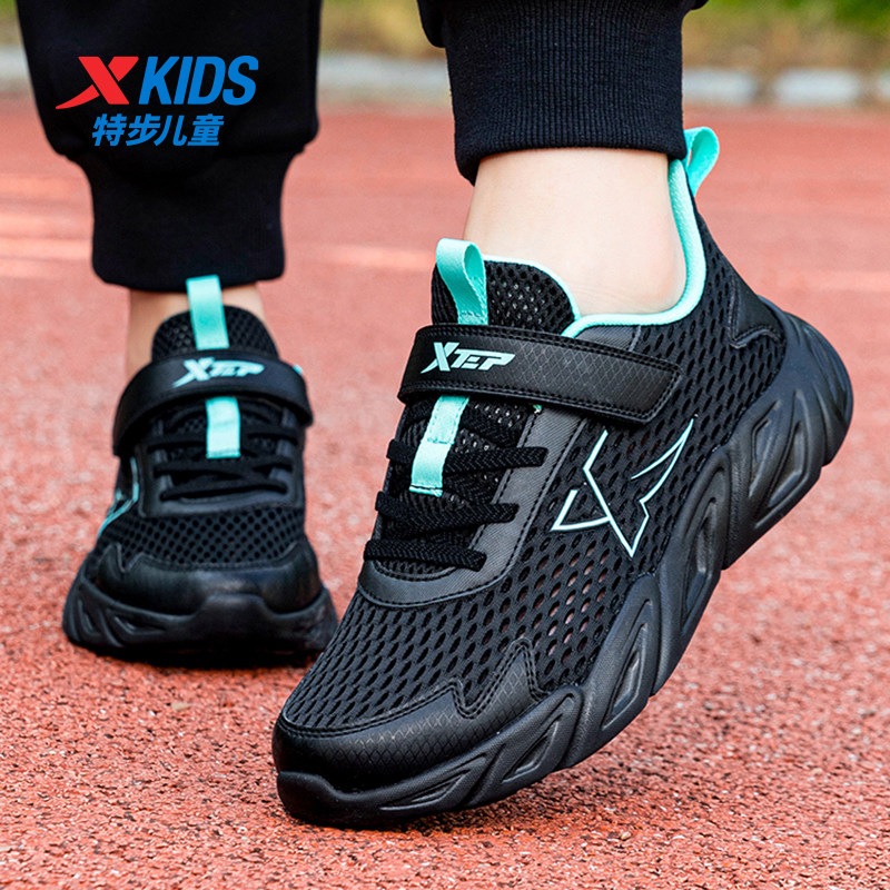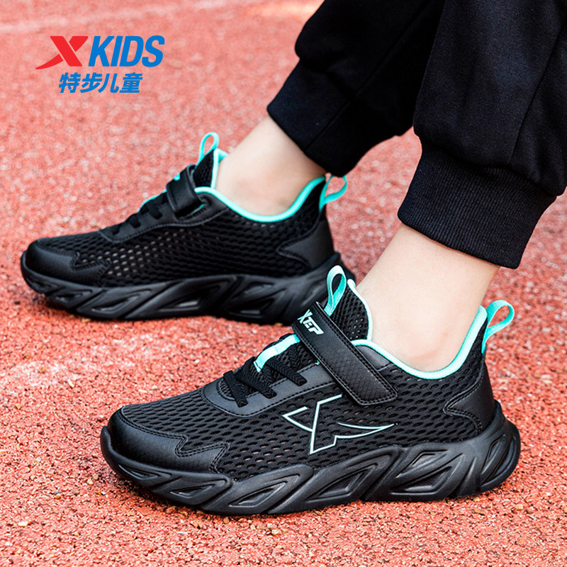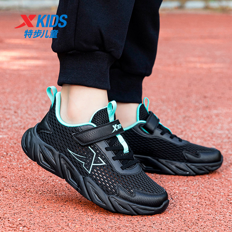 特步童鞋男童运动鞋夏季大网面透气鞋子轻便黑色跑步鞋子大童跑鞋