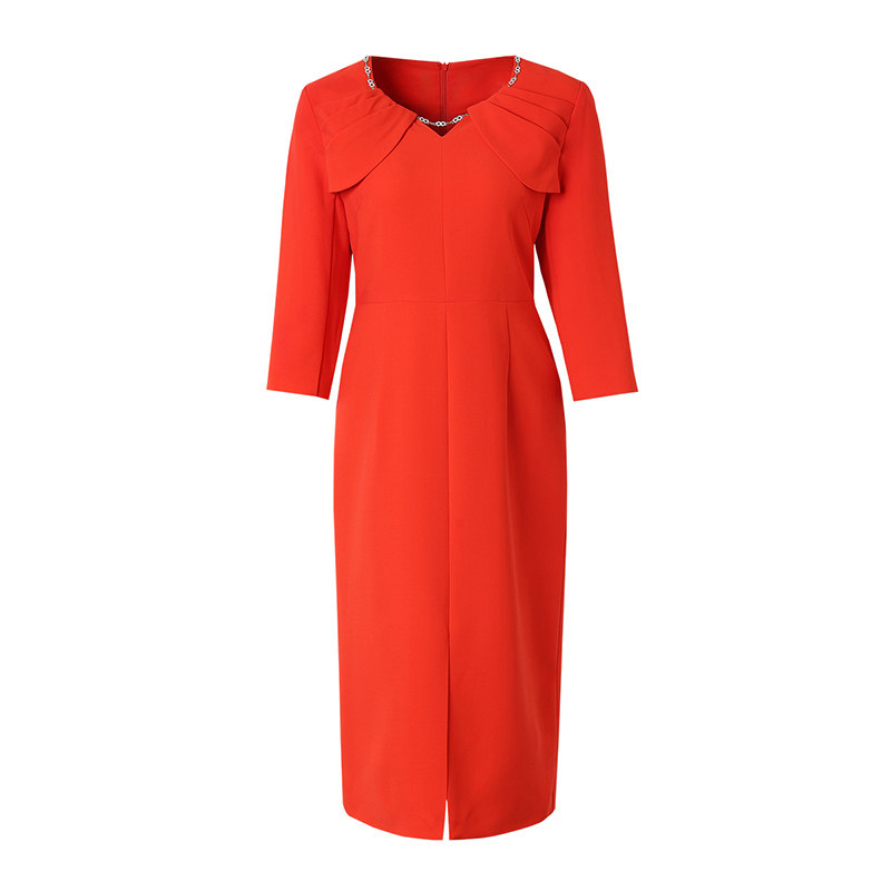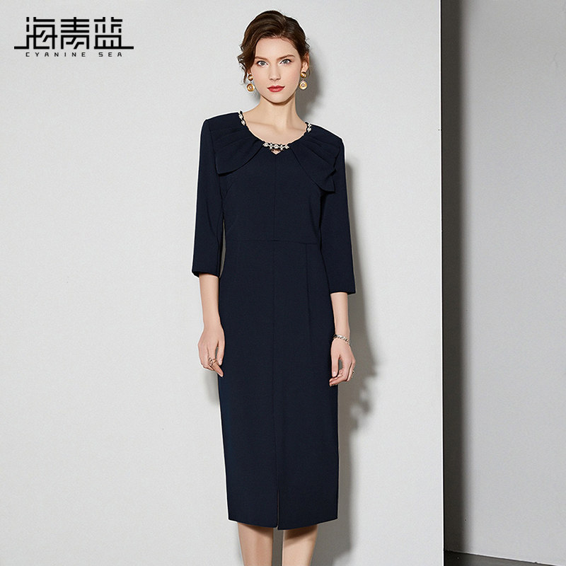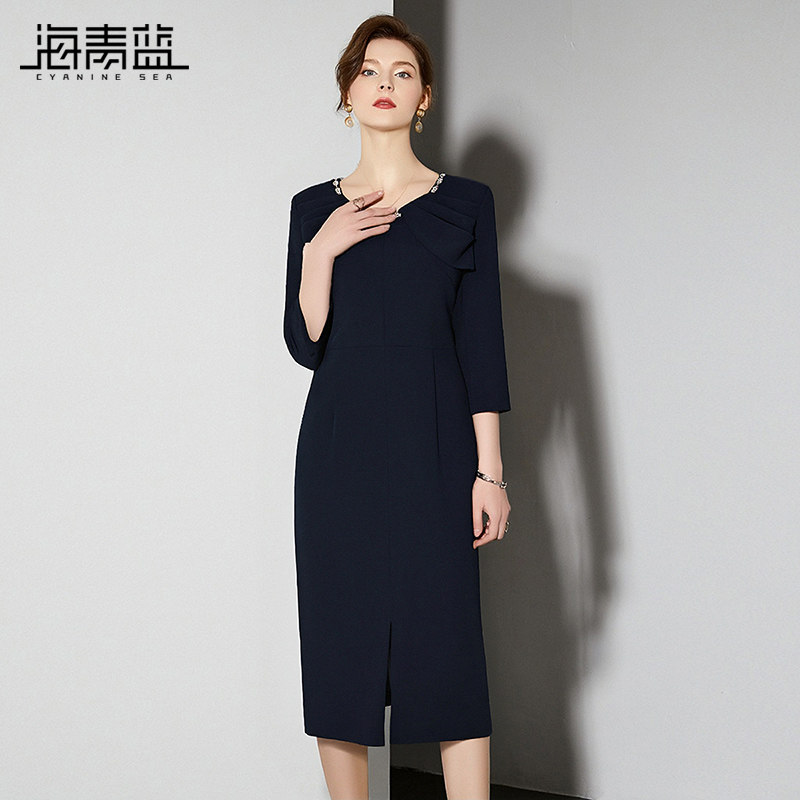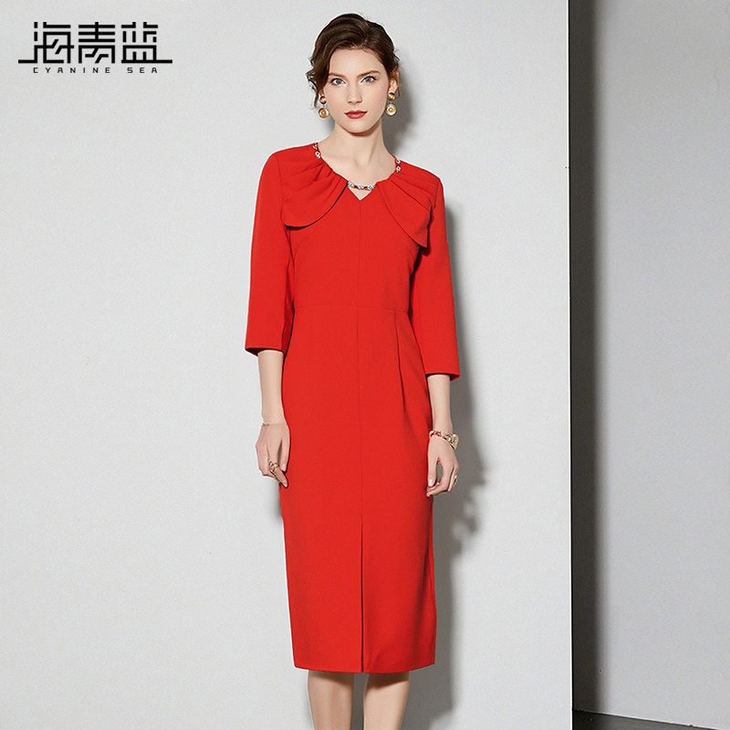 海青蓝 红色连衣裙女2026新款冬漂亮好看中袖开叉中长款女装裙子