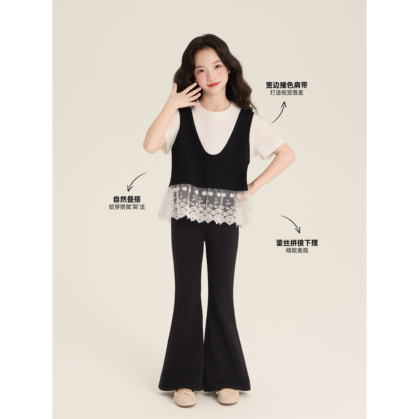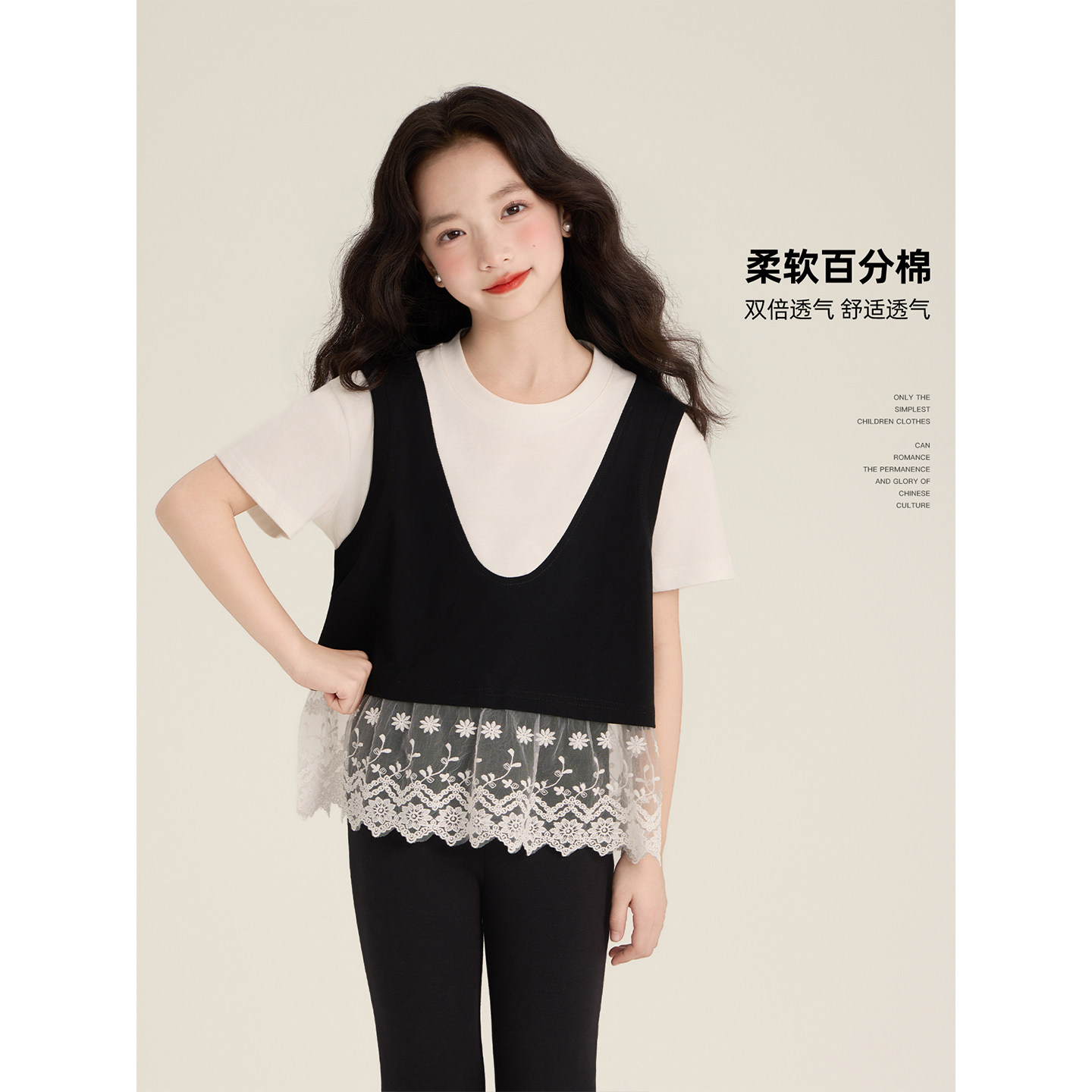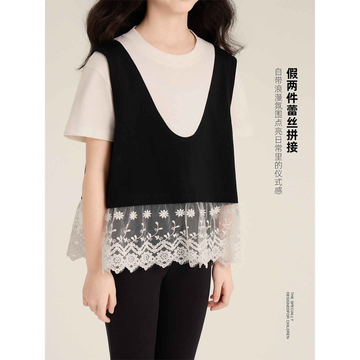 Amybaby女童上装春季2026新款高级氛围感假两件蕾丝拼接短袖上衣