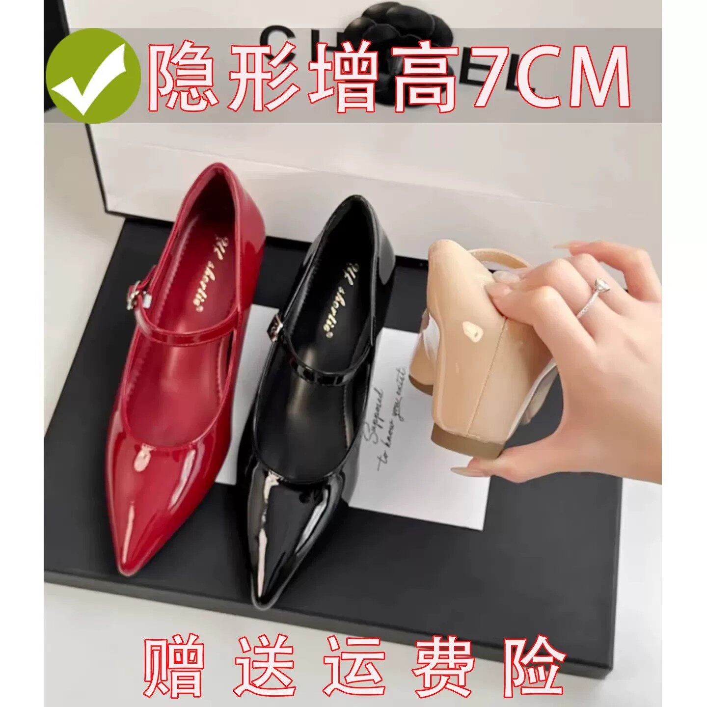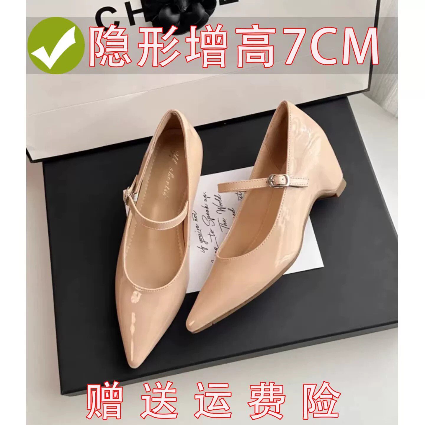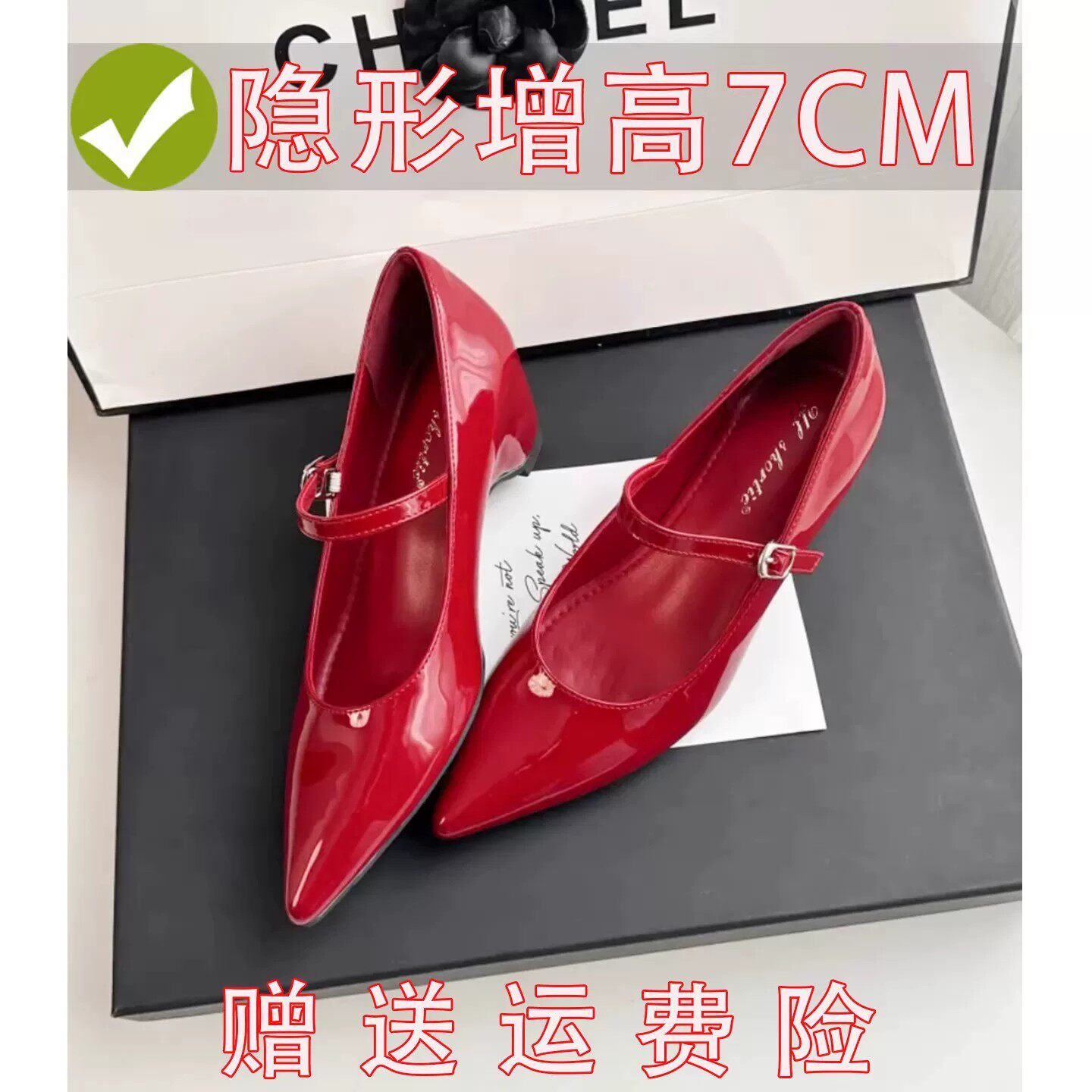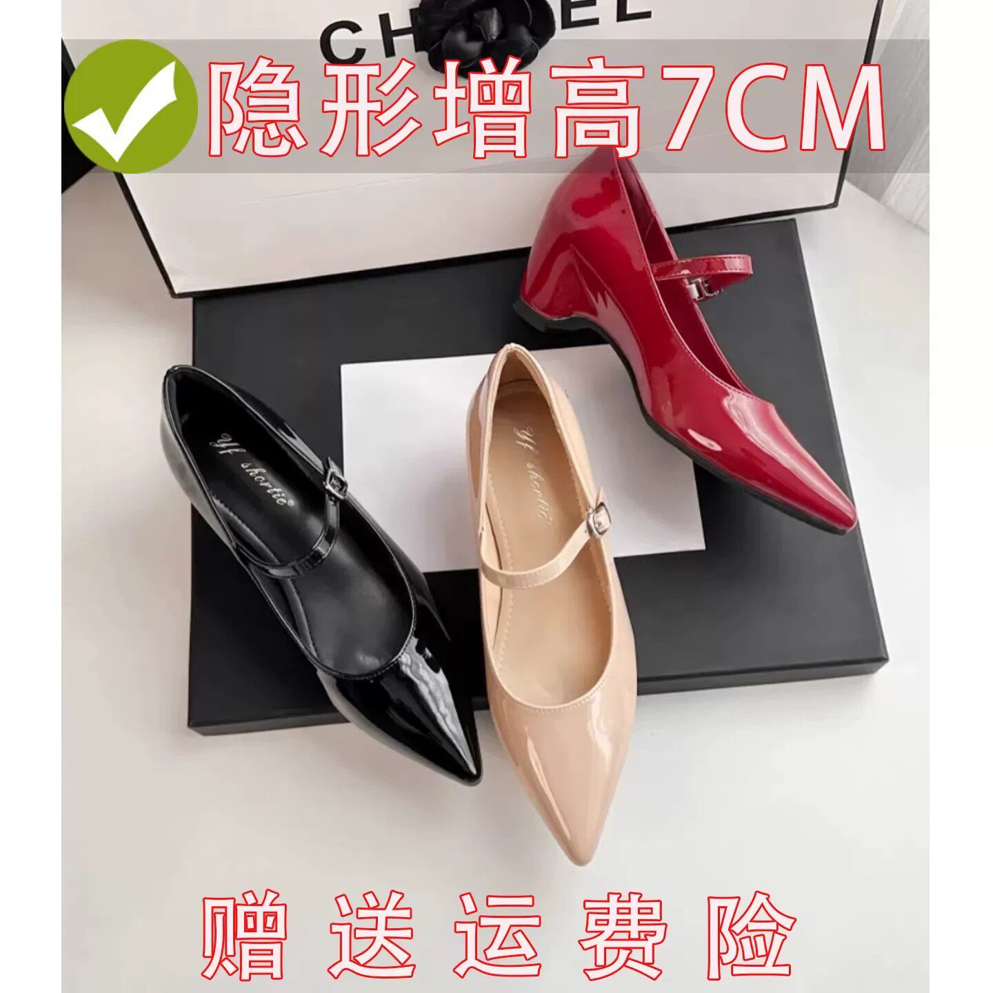 内增高7CM真皮玛丽珍鞋法式一字带尖头浅口软底不累脚通勤单鞋女