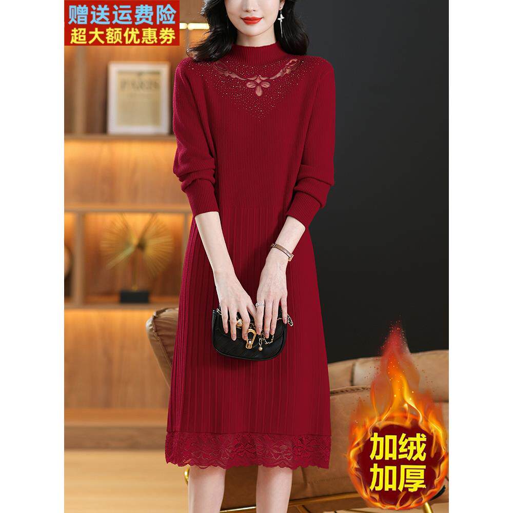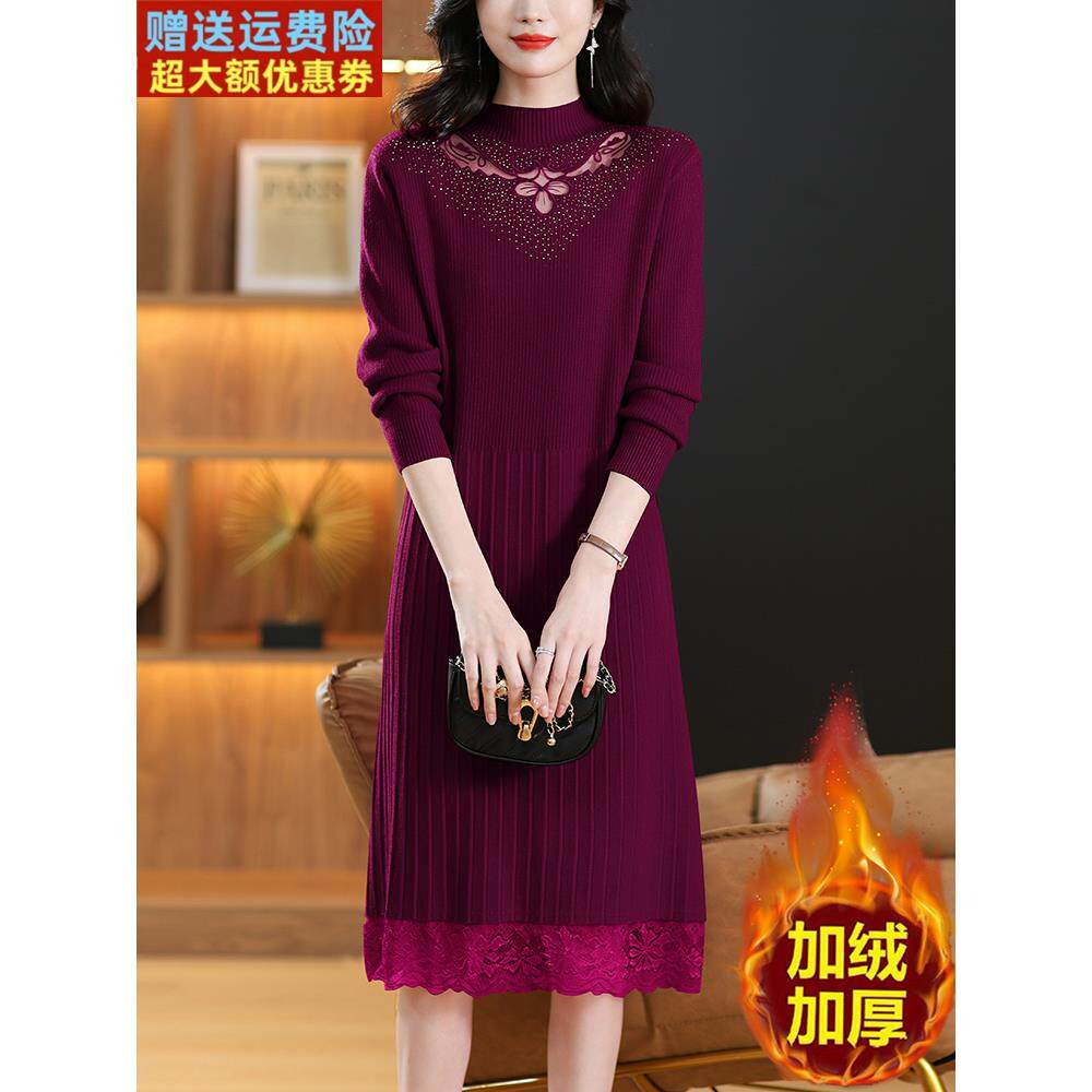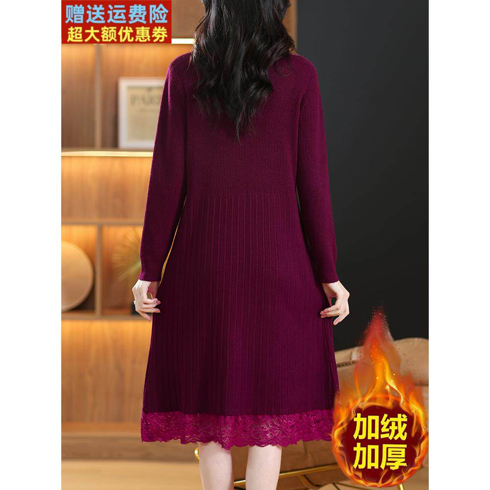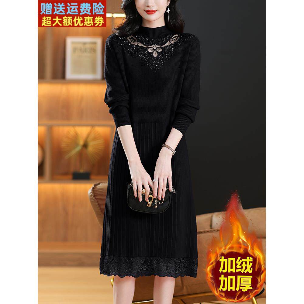 配大衣蕾丝加绒加厚连衣裙女秋冬季中年妈妈小个子毛衣内搭打底裙