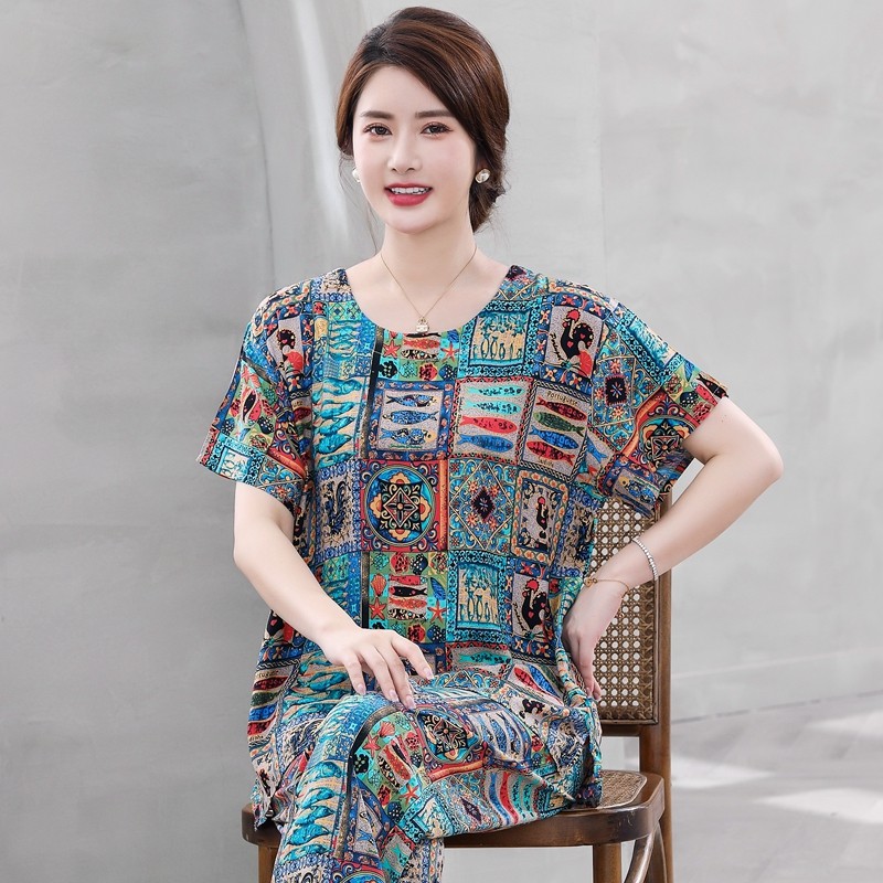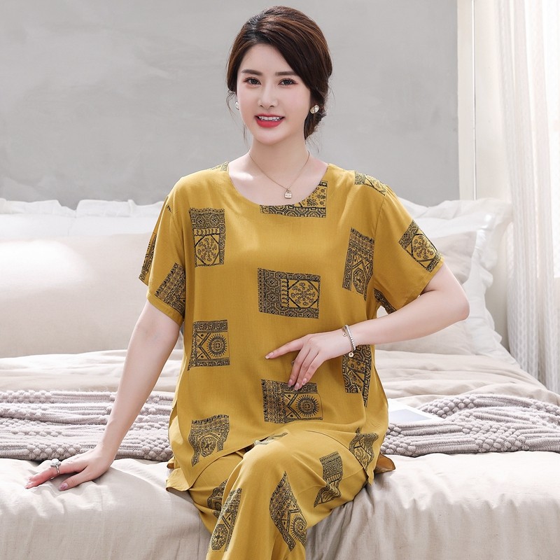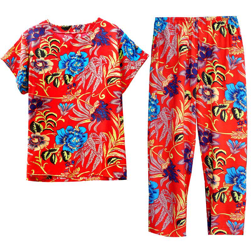 妈妈睡衣睡衣女款2026新款夏棉绸家居服套装中老年人造棉短袖薄款