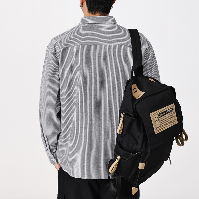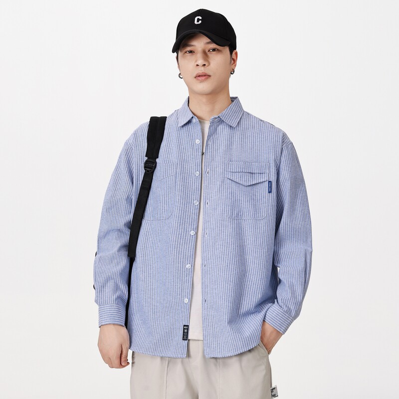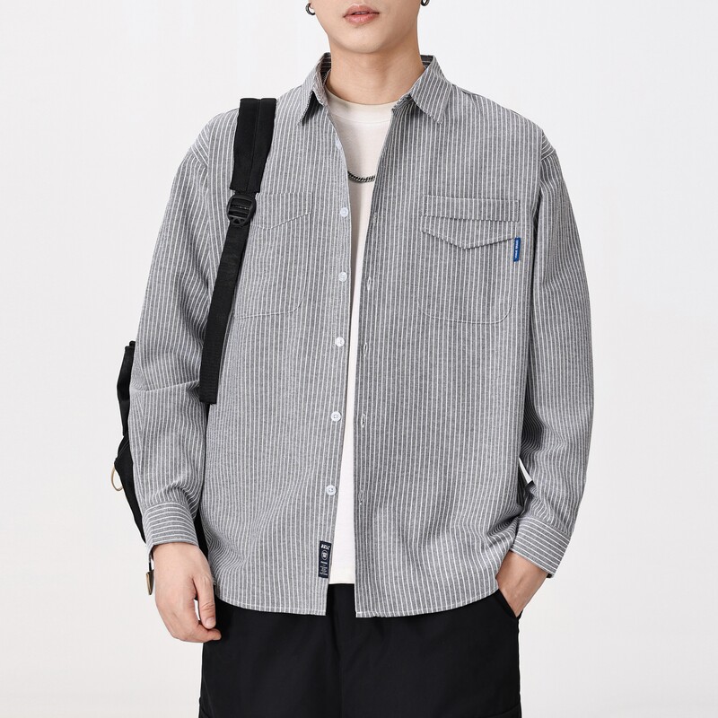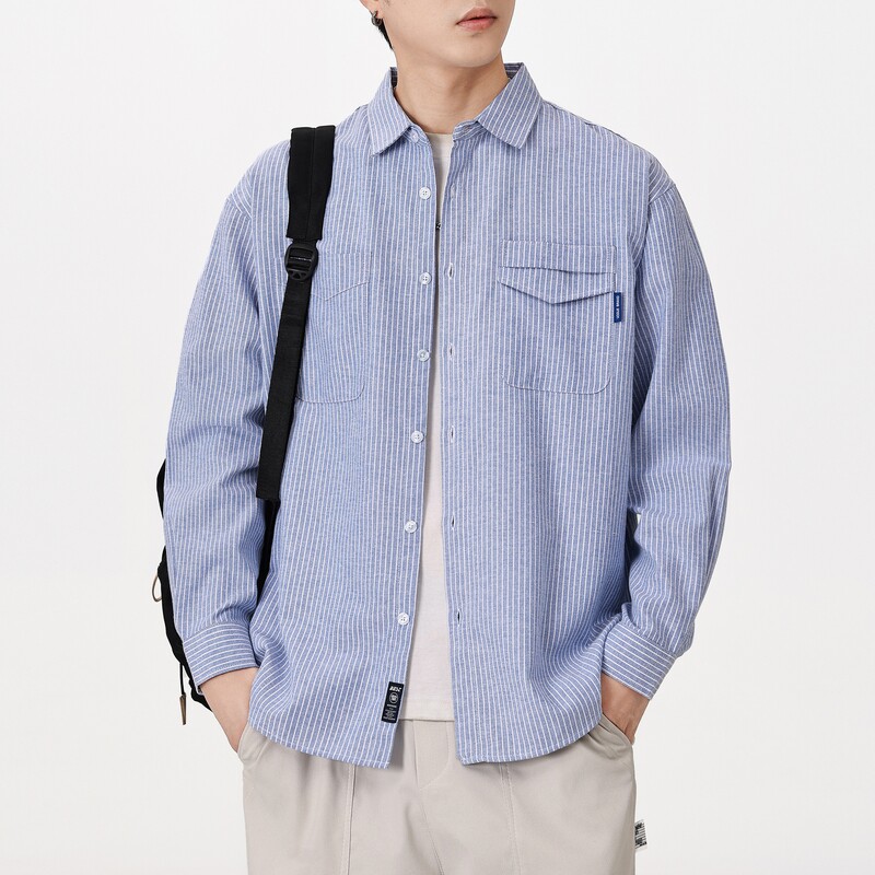 日系条纹长袖衬衫男款春季新款小清新宽松复古百搭衬衣薄款外套
