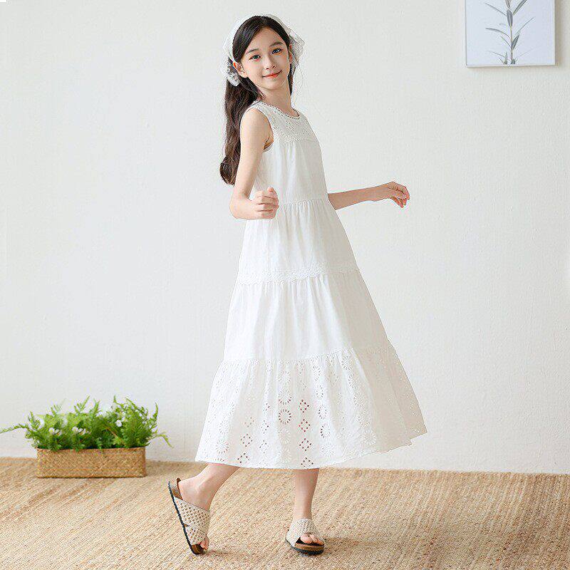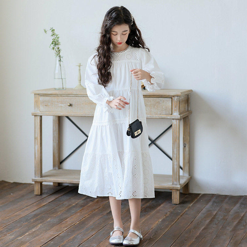 中大女童镂空长袖连衣裙2026新款韩版白色公主长裙女孩纯棉春夏装
