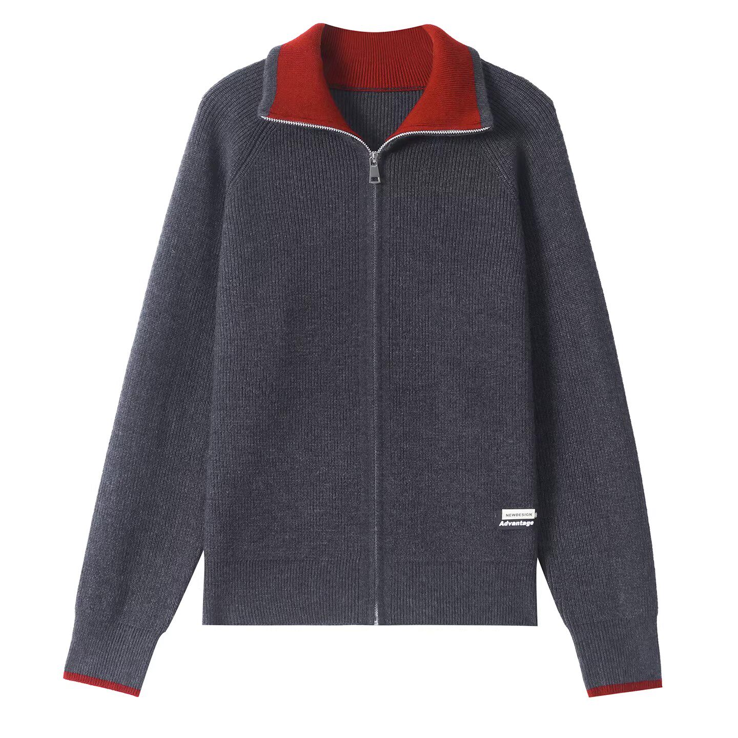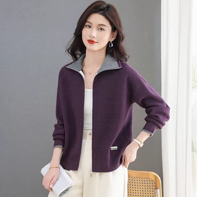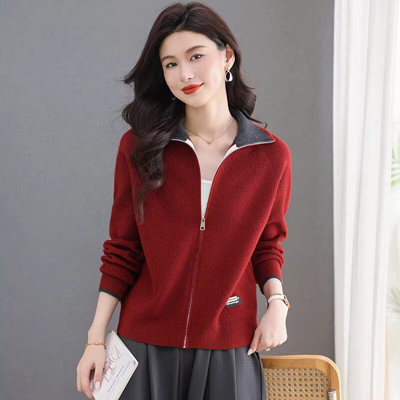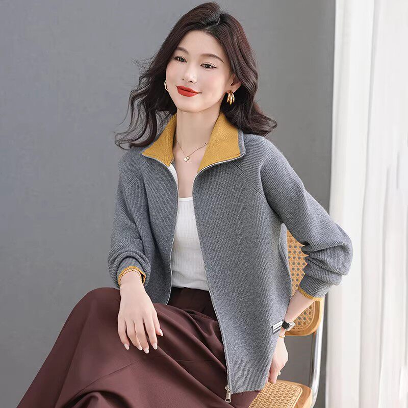 撞色翻领拉链毛衣外套女春秋短款洋气羊毛外搭加厚针织开衫小上衣