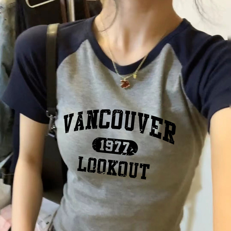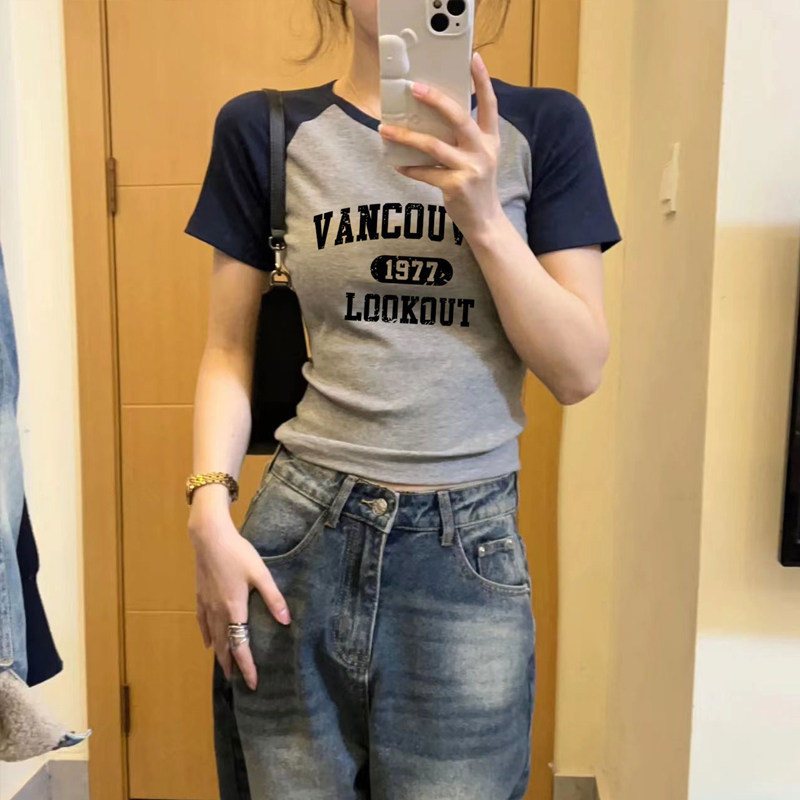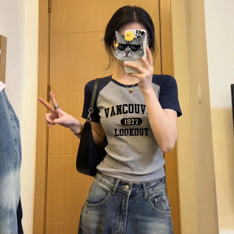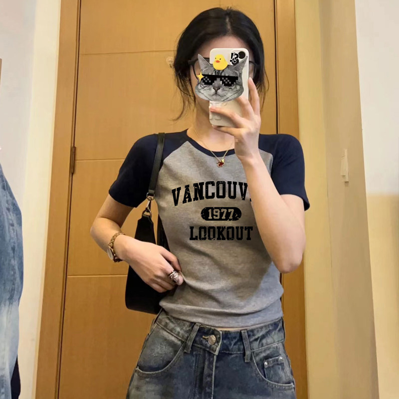 美式复古撞色插肩袖小个子短袖t恤女2026新款夏季bm打底辣妹上衣