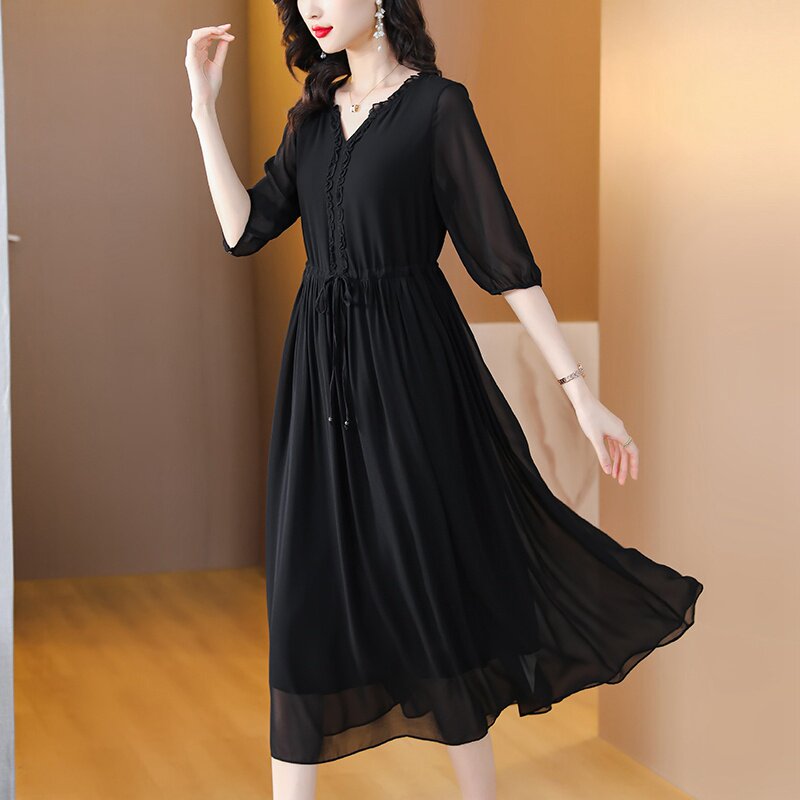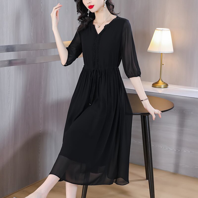 哥家高级感黑色真丝桑蚕丝连衣裙女春夏轻奢高端妈妈大码宽松长裙