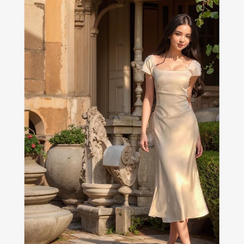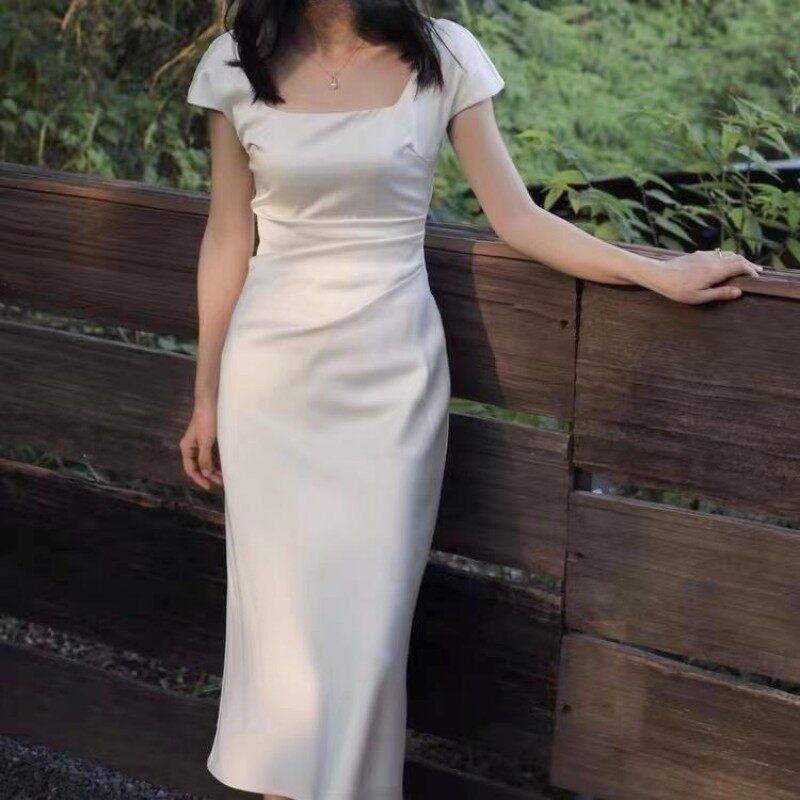法式白色短袖连衣裙女夏季2025新款收腰裙子高级感领证长裙小个子