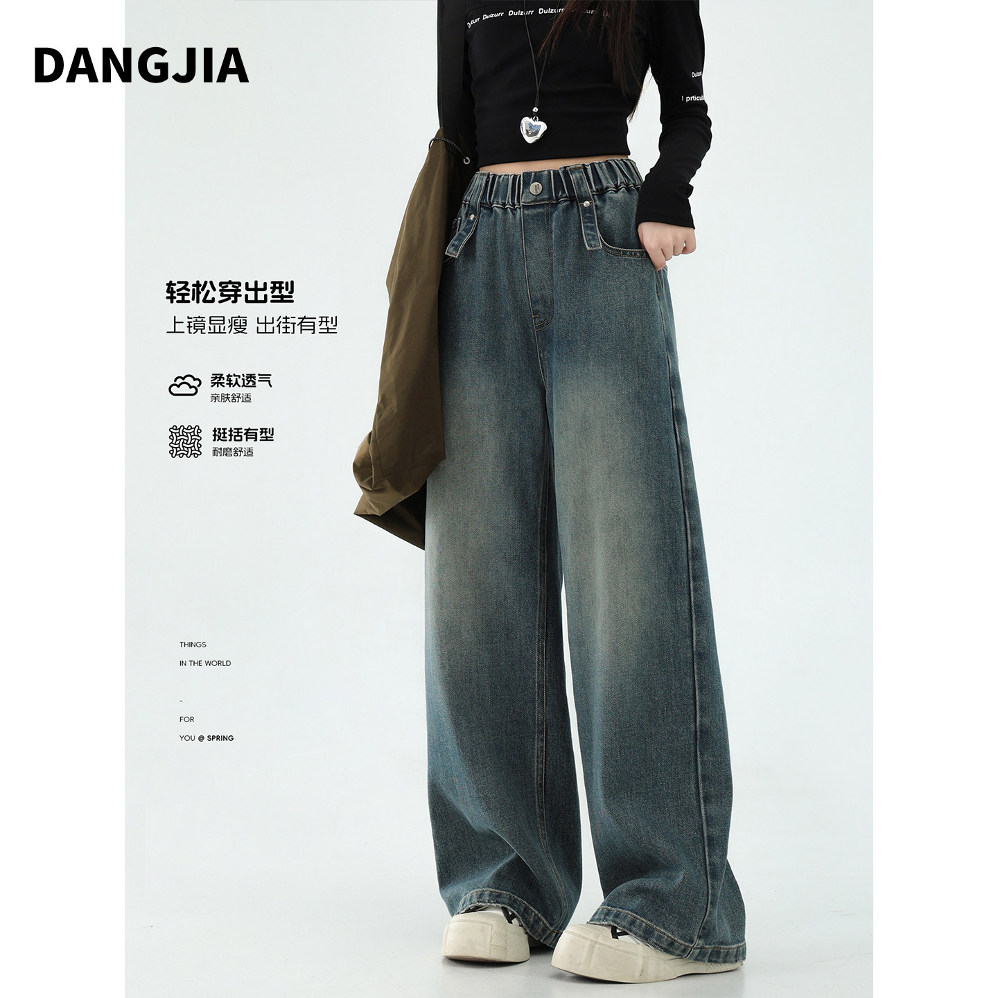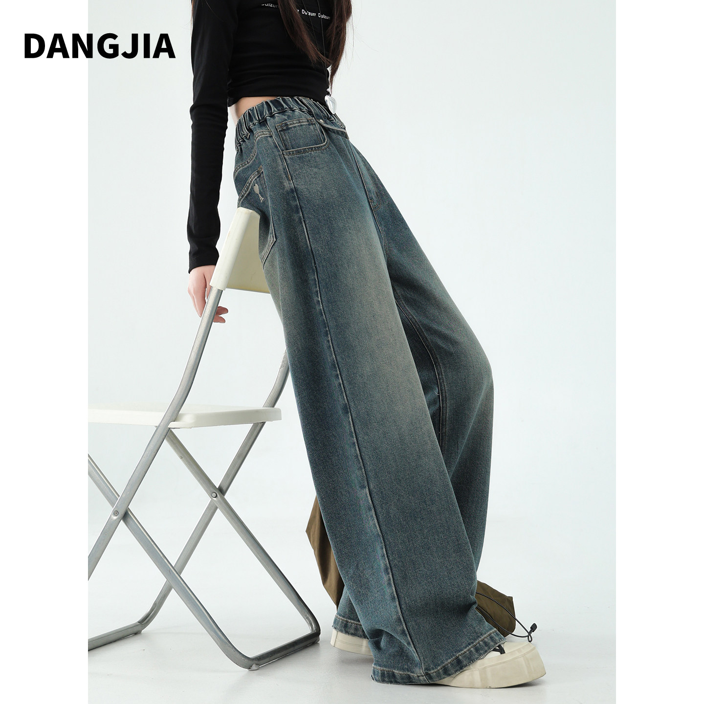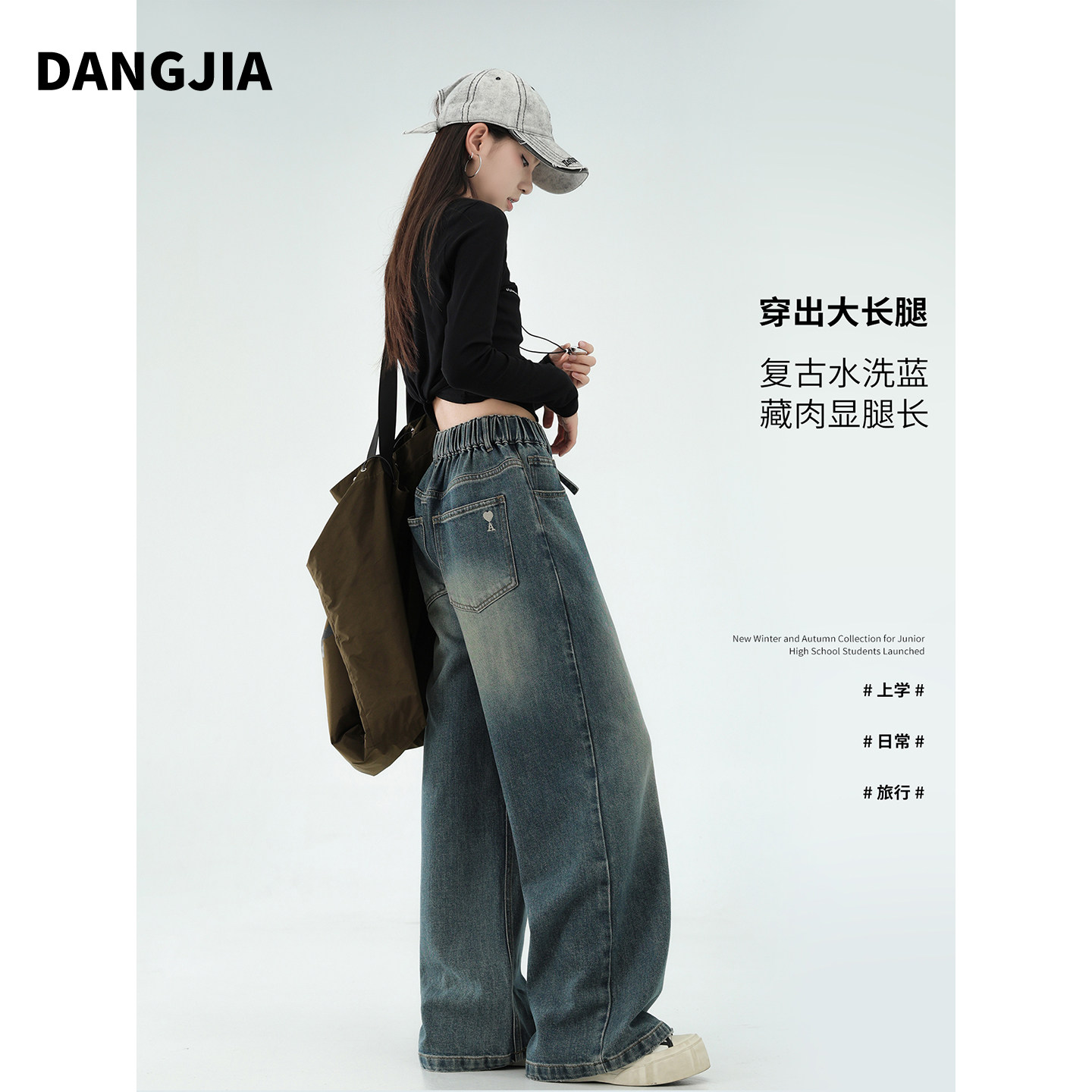 女大童深蓝色牛仔裤春秋装复古风直筒阔腿裤初中生女孩裤子青少年