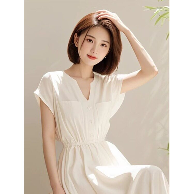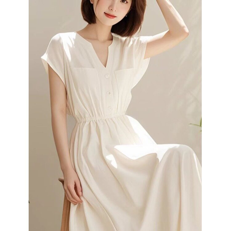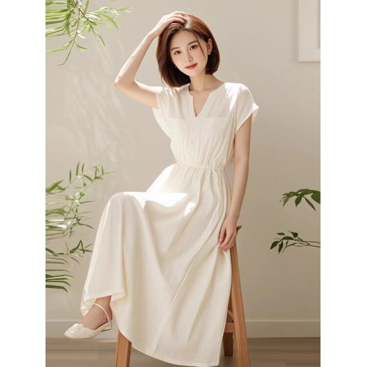 2026 夏季轻奢高级感简单大方法式气质长款白色连衣裙子女