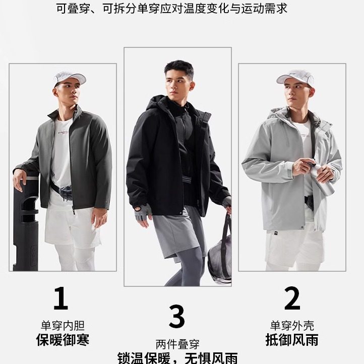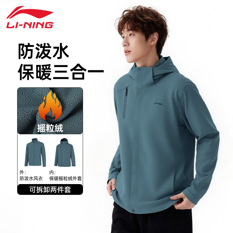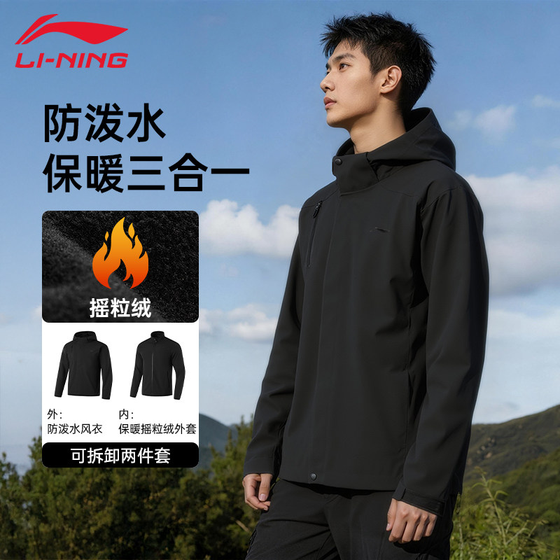 李宁运动风衣三合一外套男冬款连帽防风加绒多合一登山服AWBU007