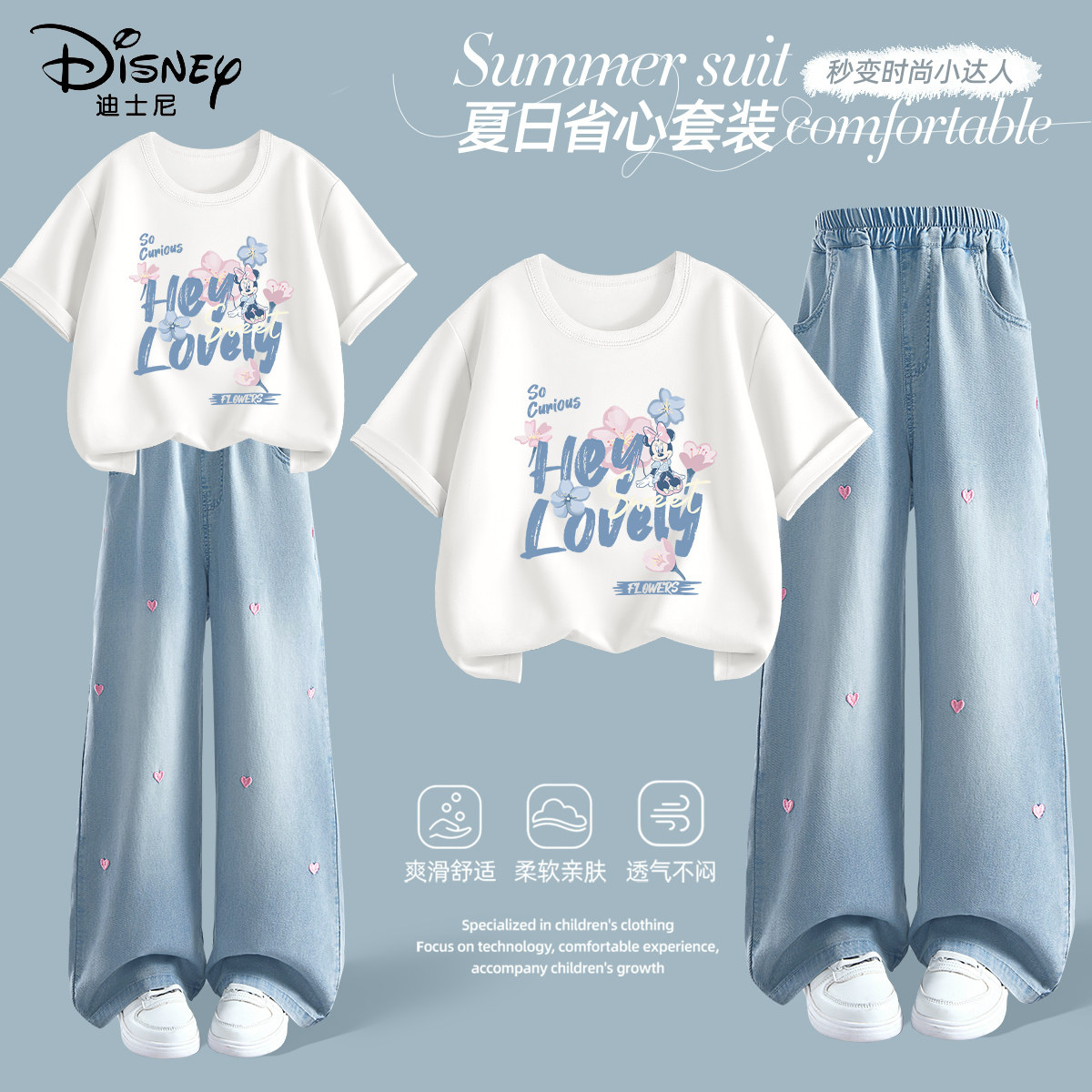 迪士尼女童夏装套装2026新款纯棉短袖t恤洋气时髦儿童轻薄牛仔裤