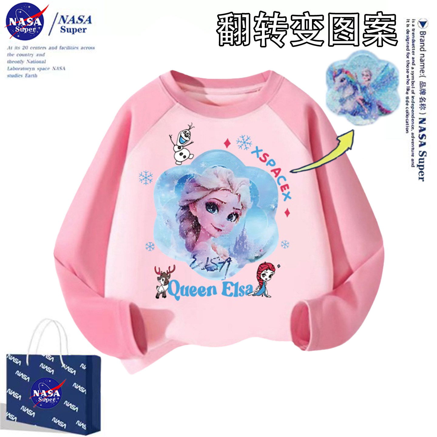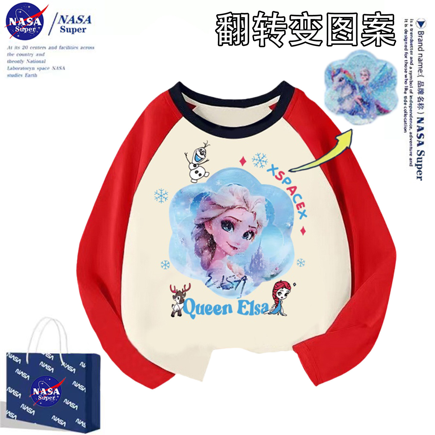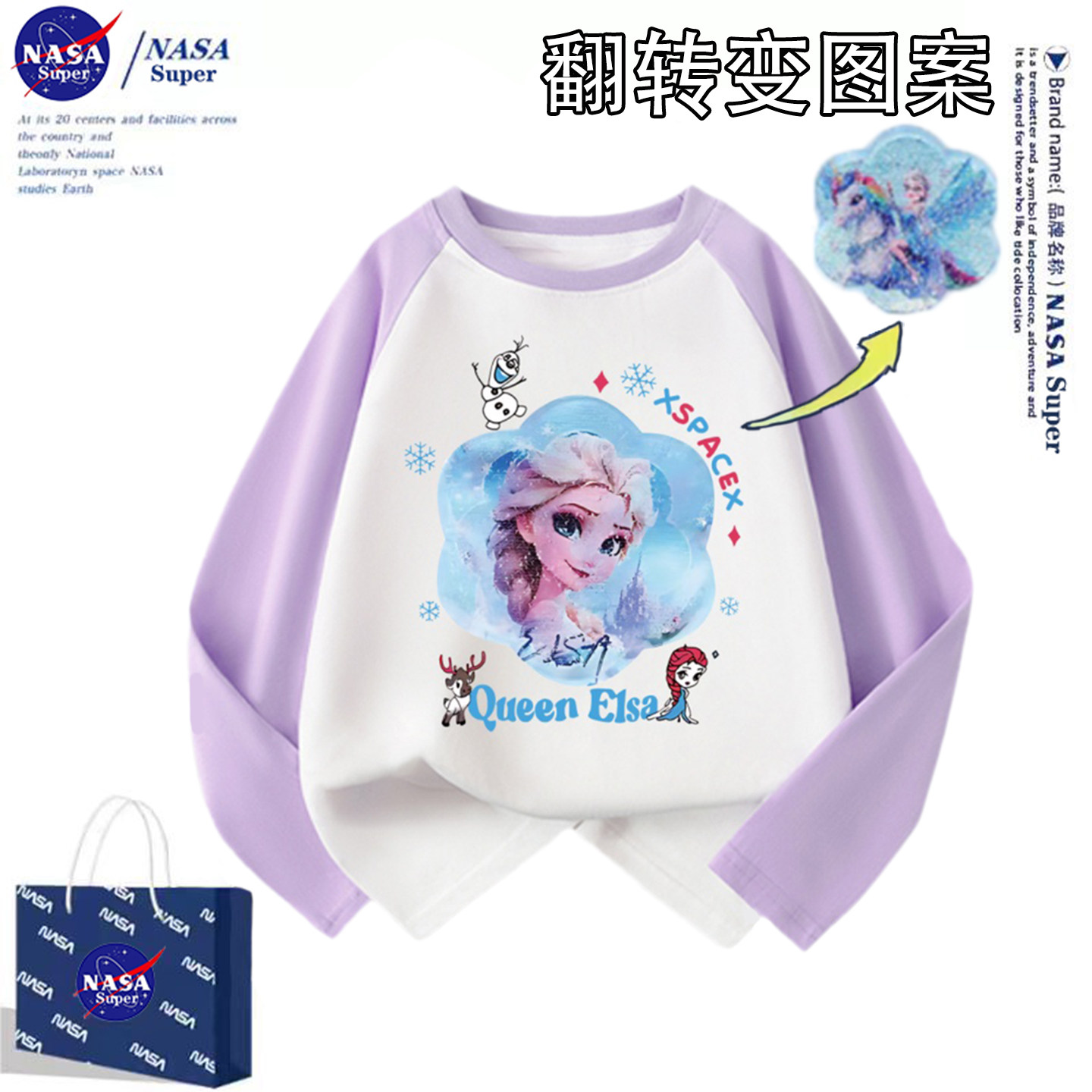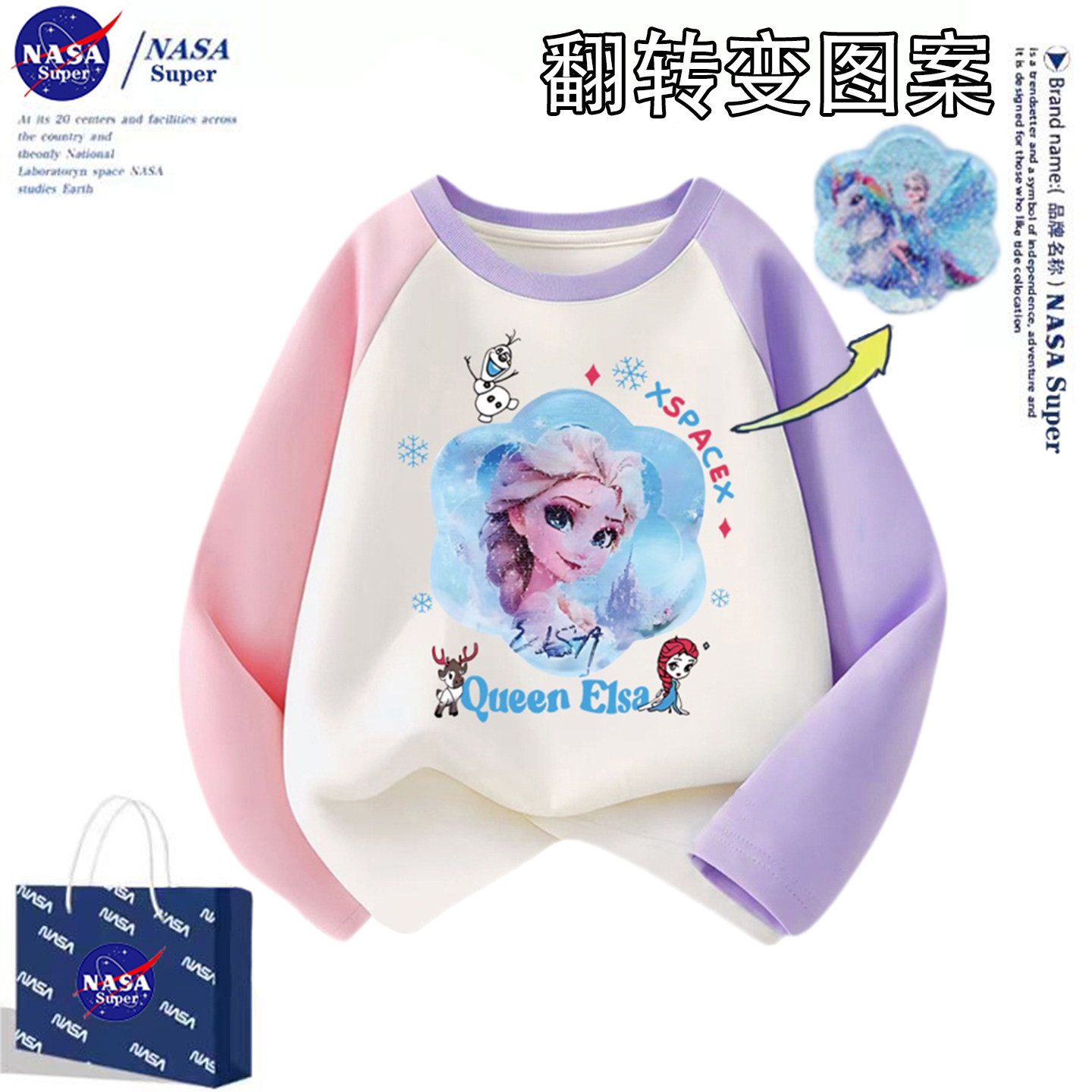 冬季女童NASA爱莎公主长袖t恤打底衫中大童纯棉翻转图案变色上衣