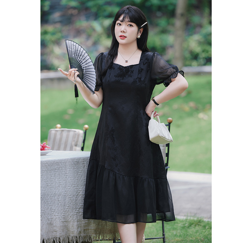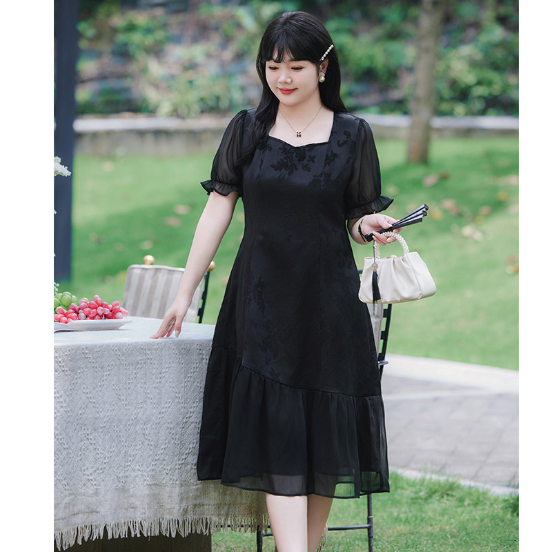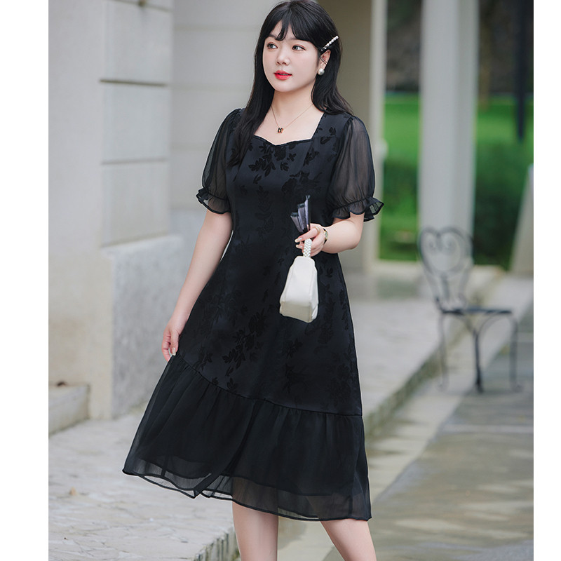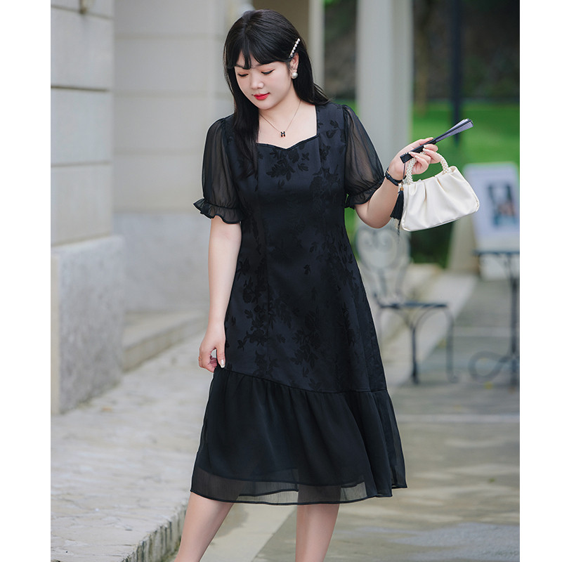 夏装新款显瘦大码胖MM雪纺连衣裙长款气质收腰遮肚子雪纺长裙黑色
