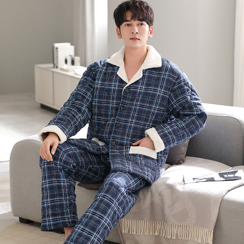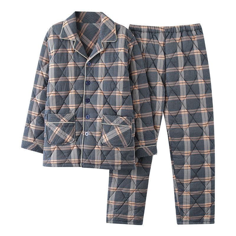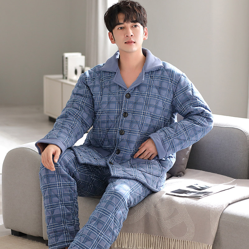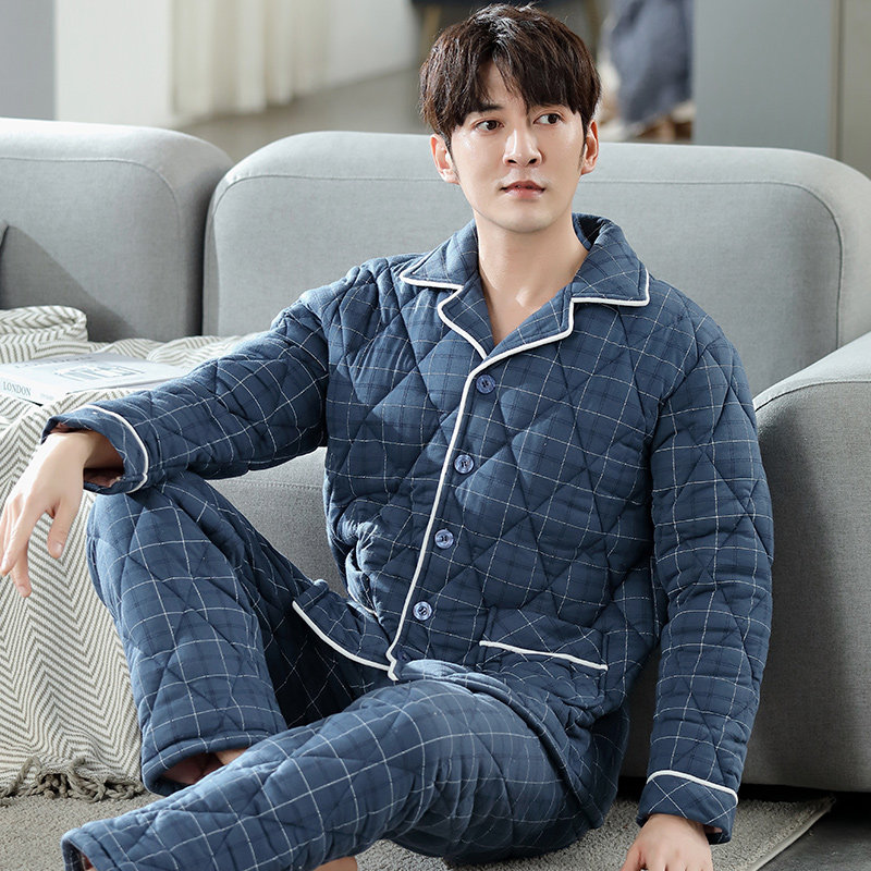睡衣男士冬季三层加厚纯棉冬天夹棉保暖大码中老年家居服两件套装
