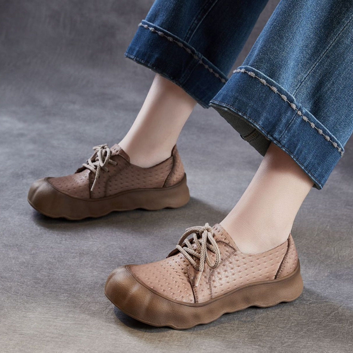 复古真皮手工编织单鞋2026新款系带女式休闲鞋子头层牛皮平底女鞋