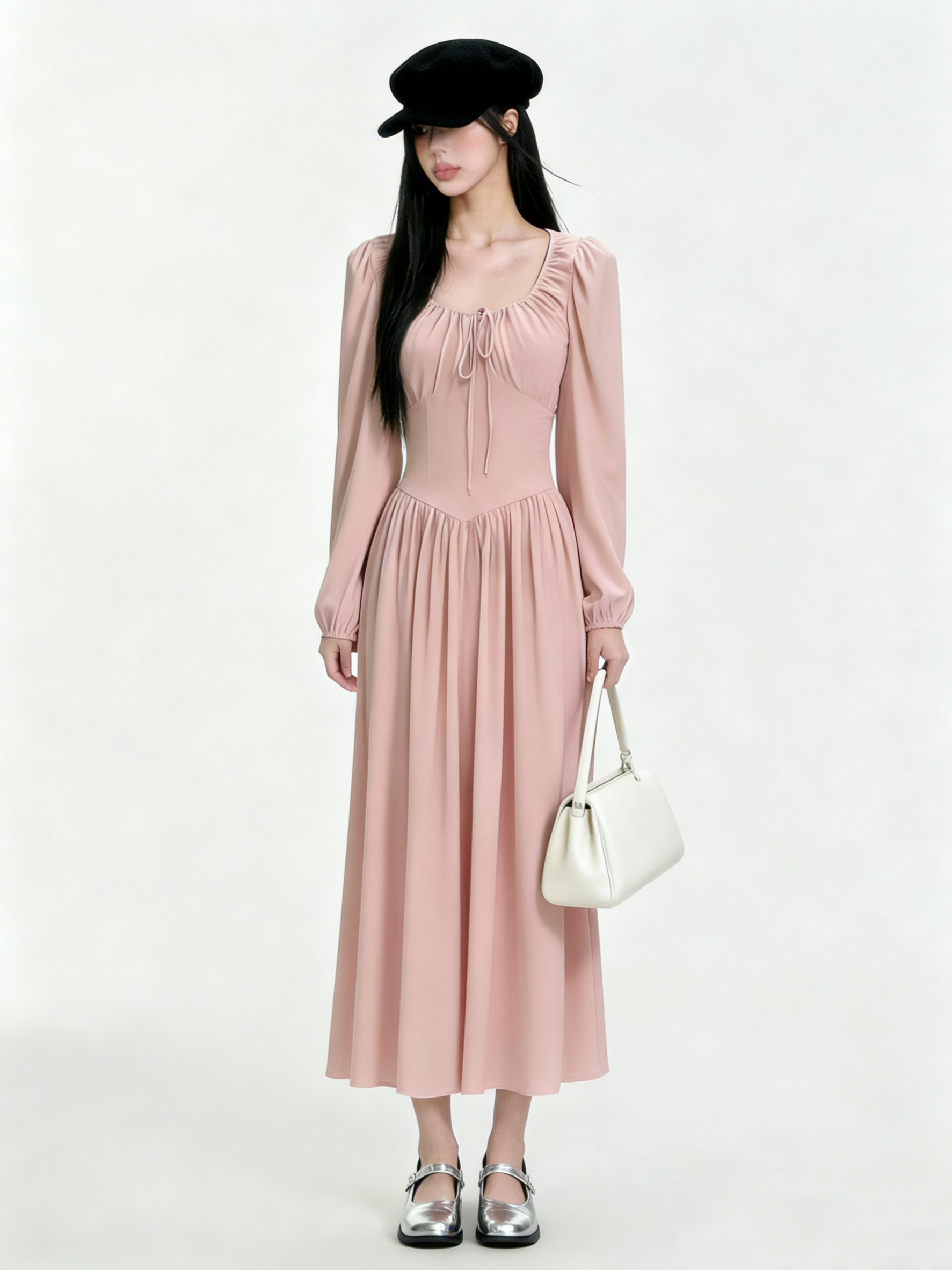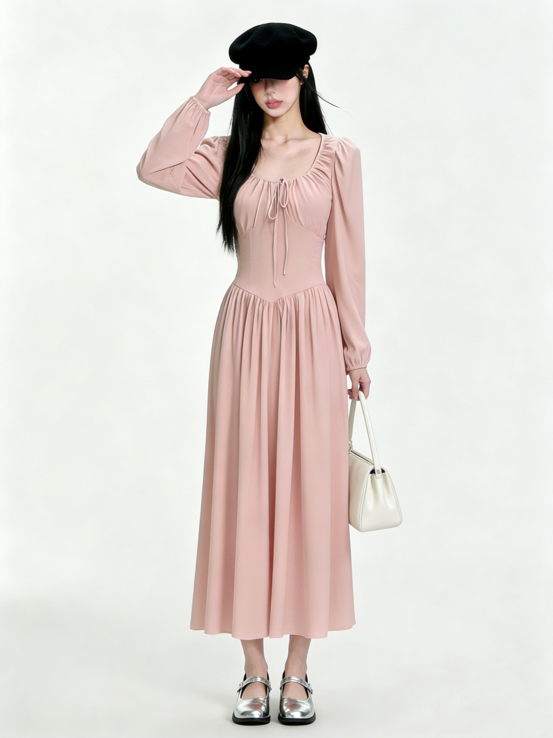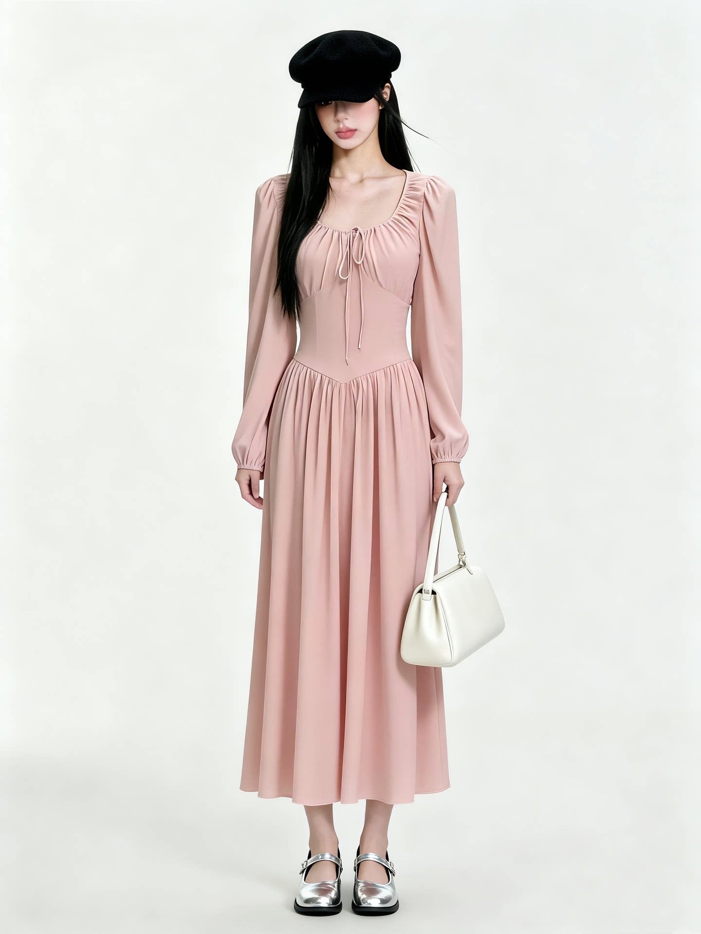 Bubble Cui法式初恋方领连衣裙女长袖夏季新款收腰气质长裙