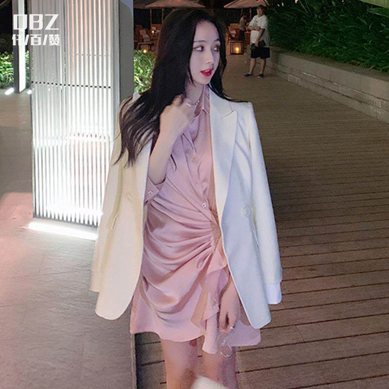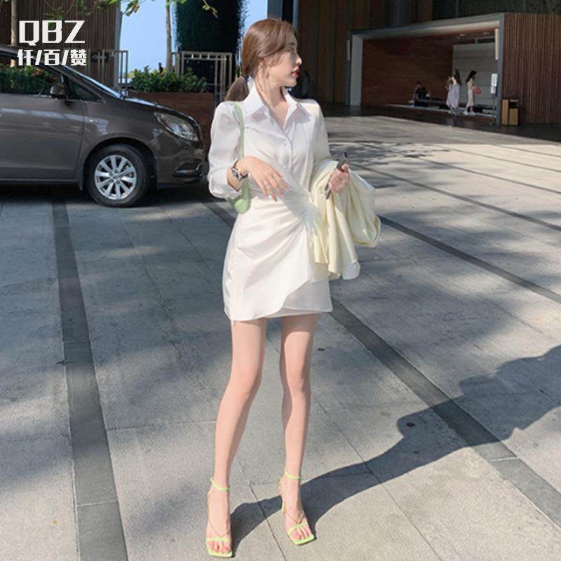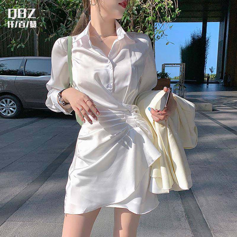 白色连衣裙女春绸缎法式收腰短款裙子长袖设计感小众不规则衬衫裙