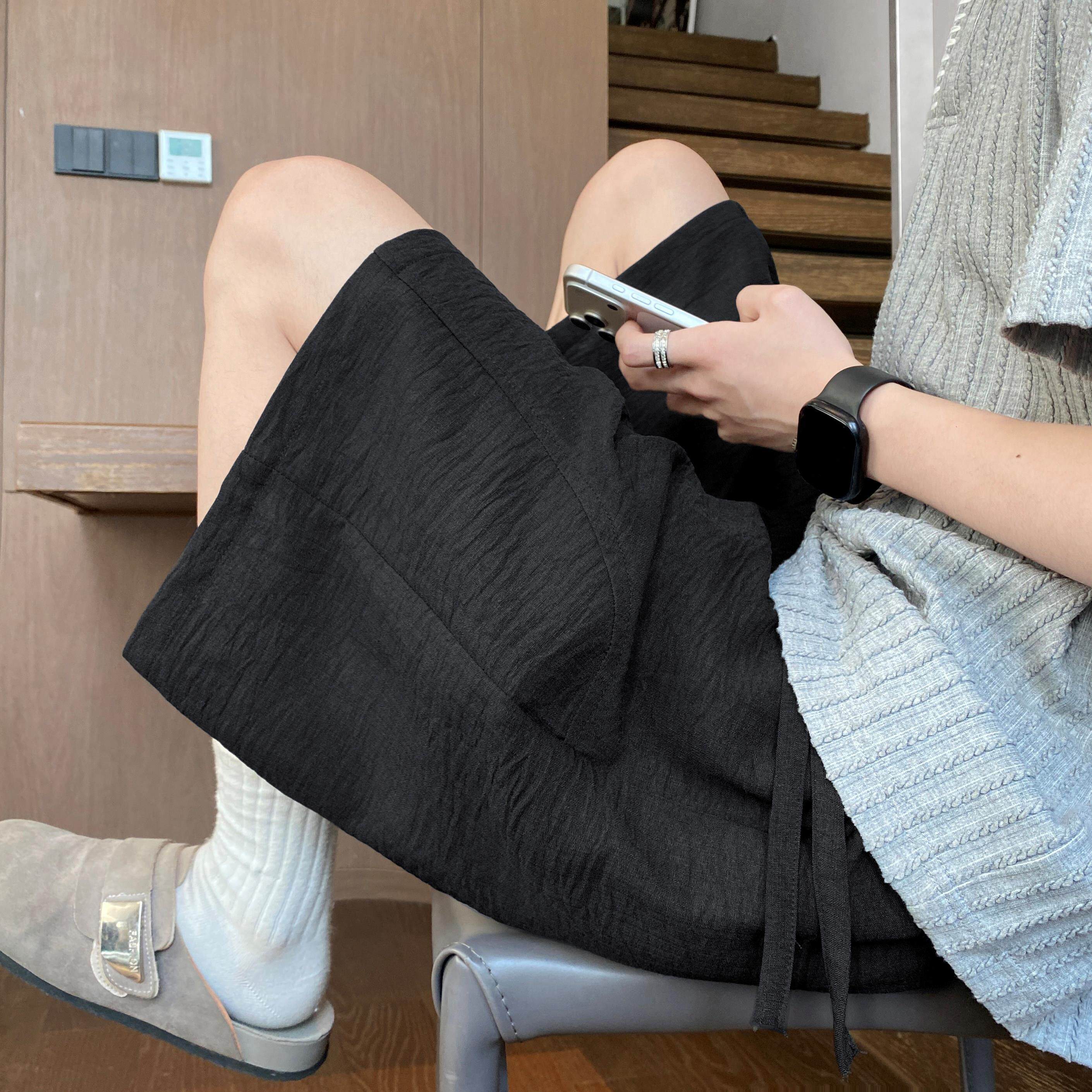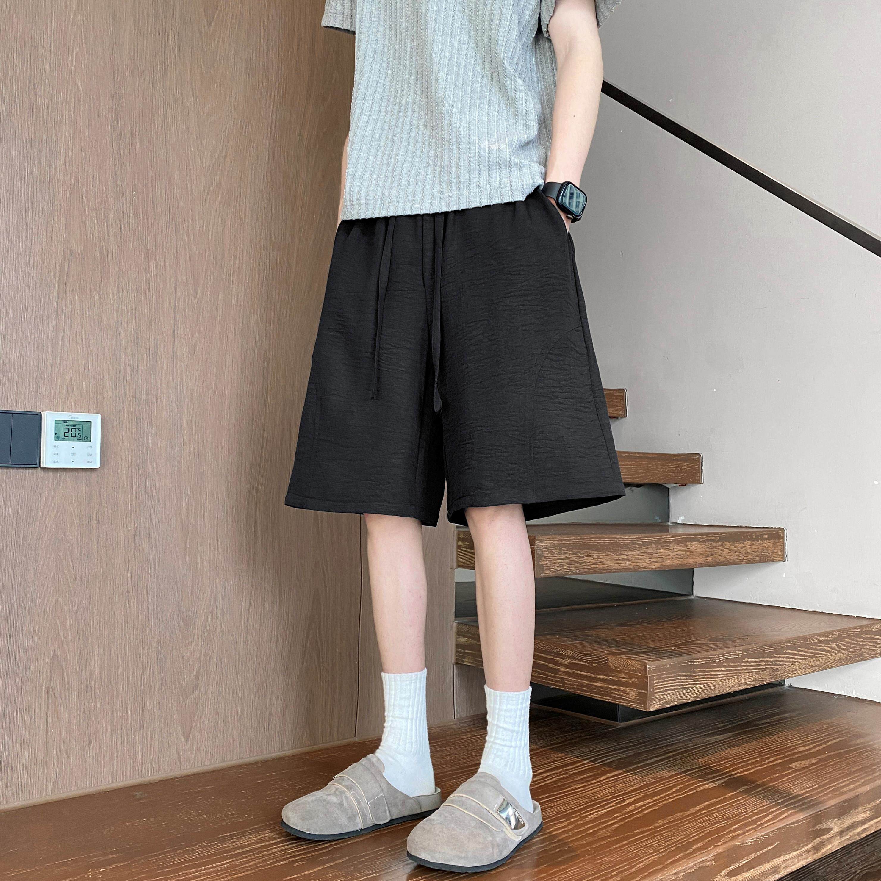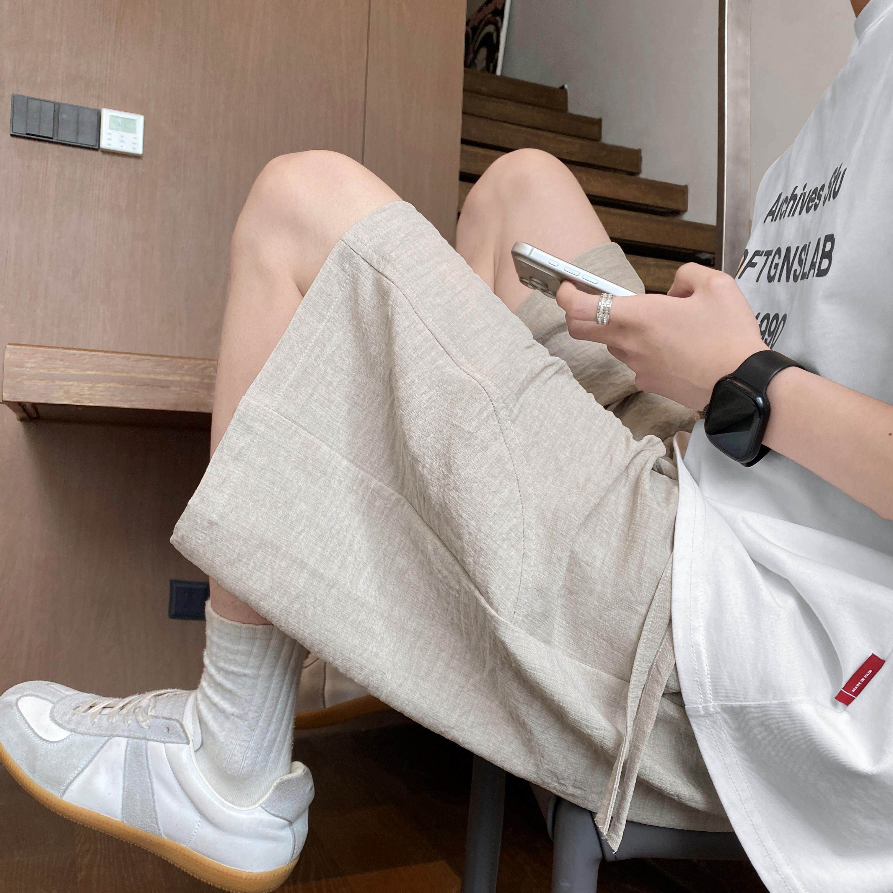 斜切拼接亚麻短裤男款夏季外穿薄款休闲中裤宽松直筒男士五分裤子