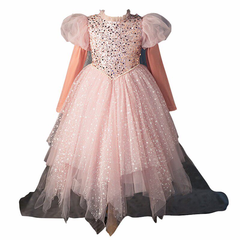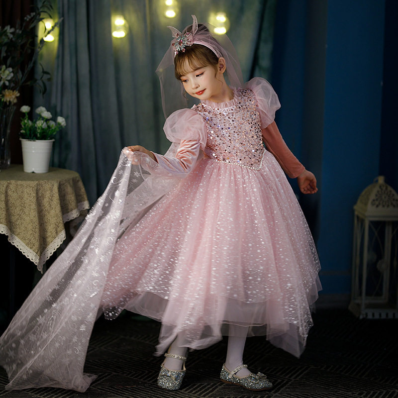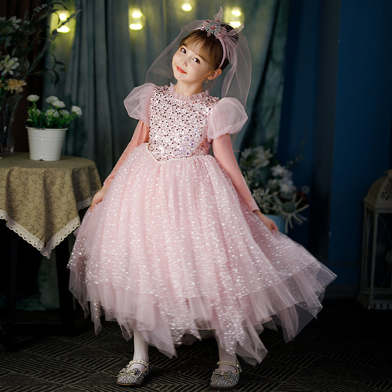 女童秋季连衣裙2023秋冬粉色珠片儿童礼服裙子不规则洛丽塔公主裙