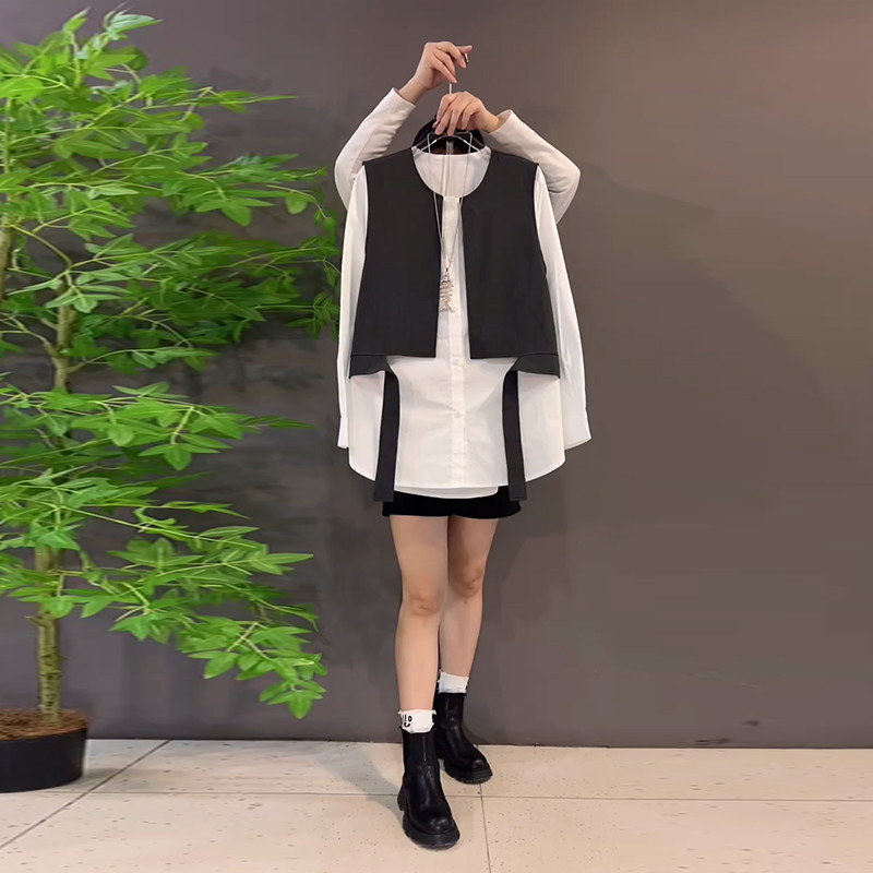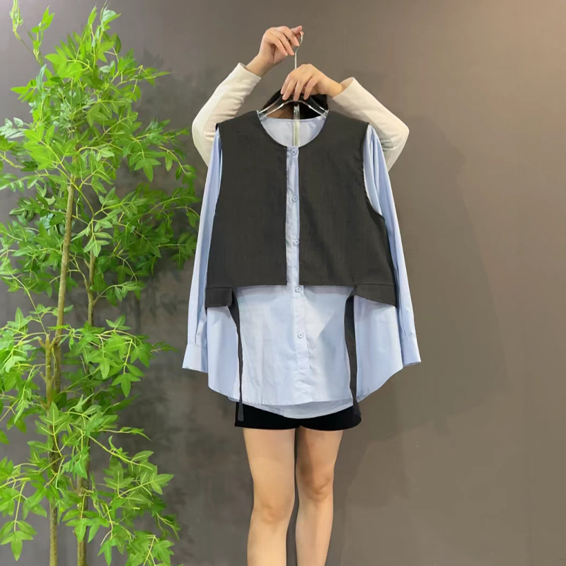 加肥大码女装拼色马甲假两件上衣胖妹妹2026早春新款百搭韩版衬衫