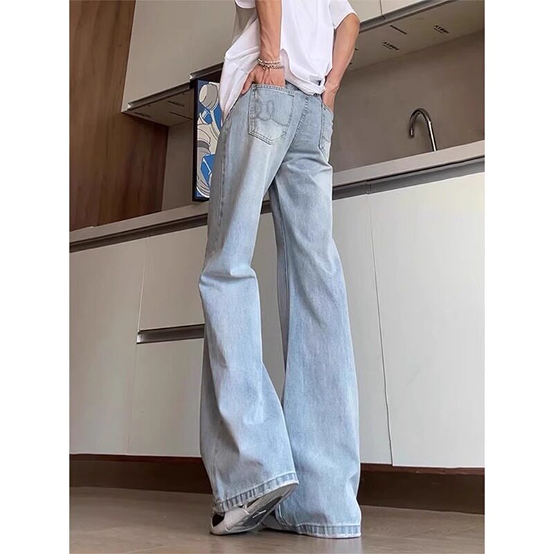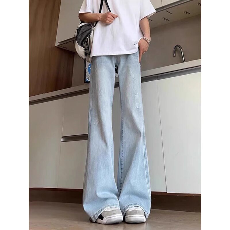浅蓝色微喇叭牛仔裤男款直筒显瘦裤子美式复古vibe高街阔腿弯刀裤
