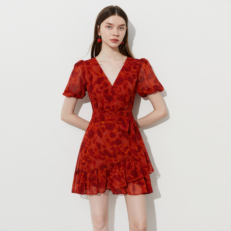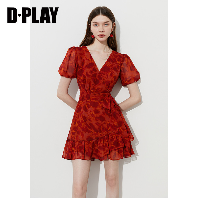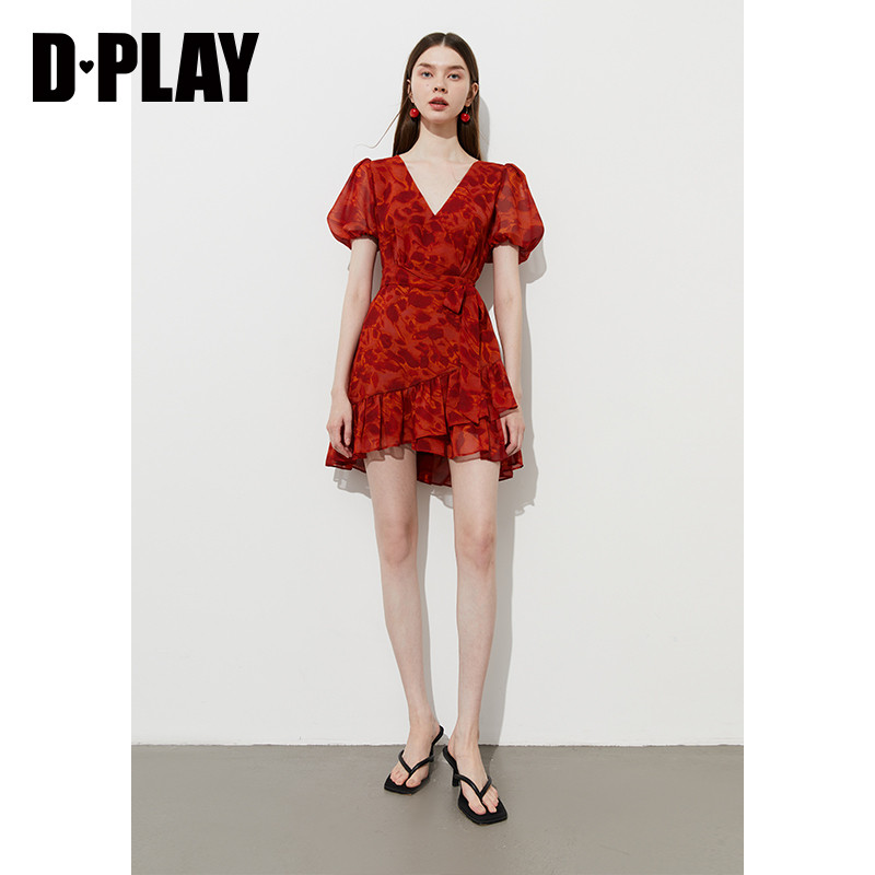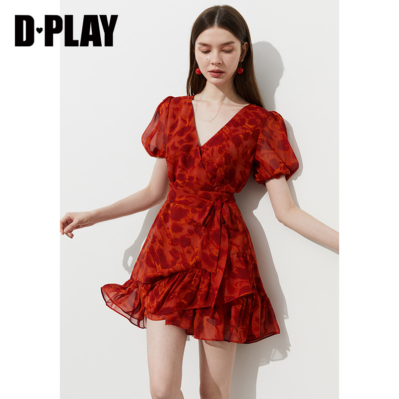 DPLAY【法式茶歇系列】2026年春季新款红色碎花连衣裙女度假短裙