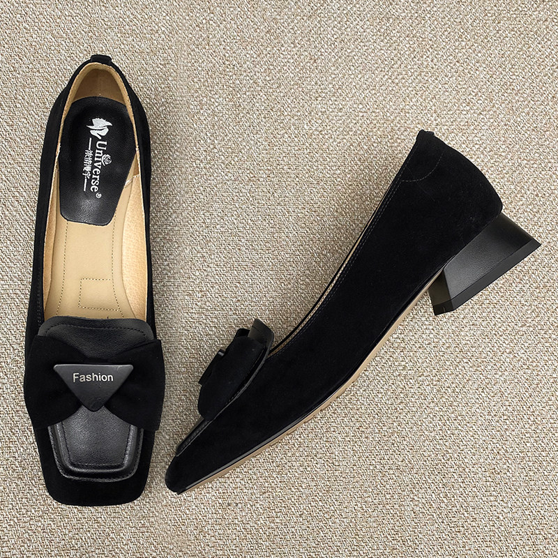 春季新款单鞋女粗跟低跟女士皮鞋方头浅口真皮女鞋透气舒适不闷脚