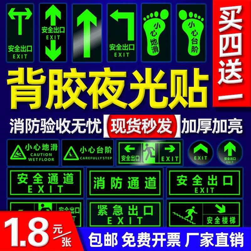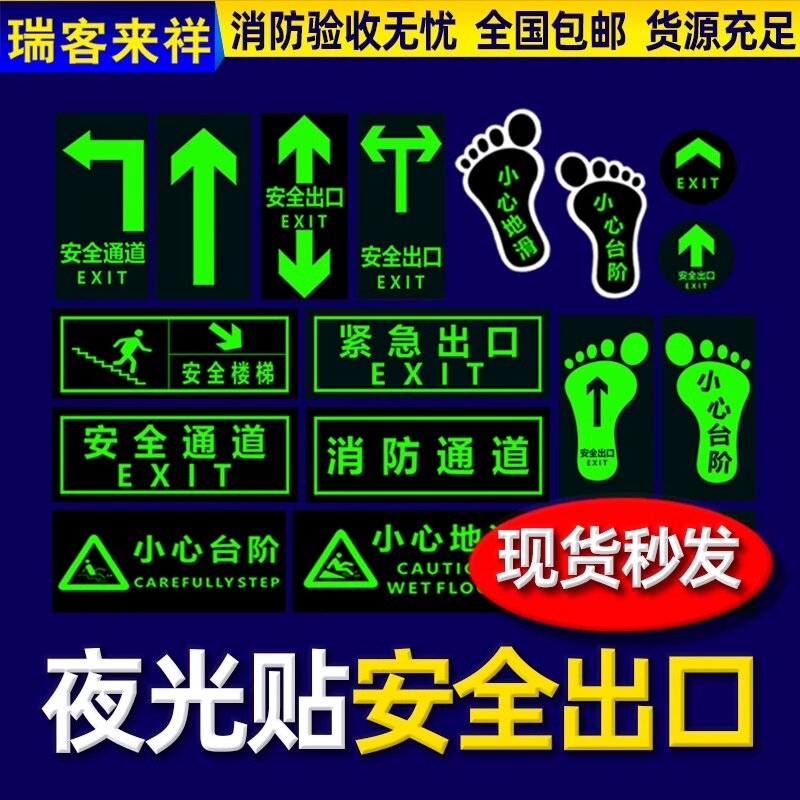 安全出口应急逃生楼梯牌指示牌消防标识标牌夜光地贴墙贴通道紧急贴纸提示警示标志荧光疏散箭头小心台阶地滑