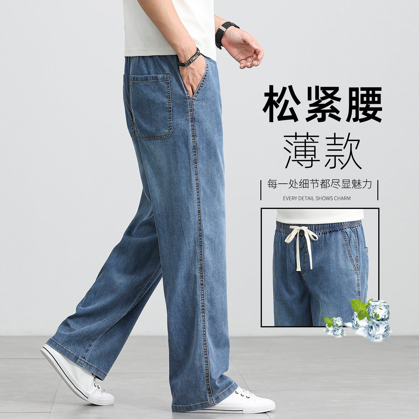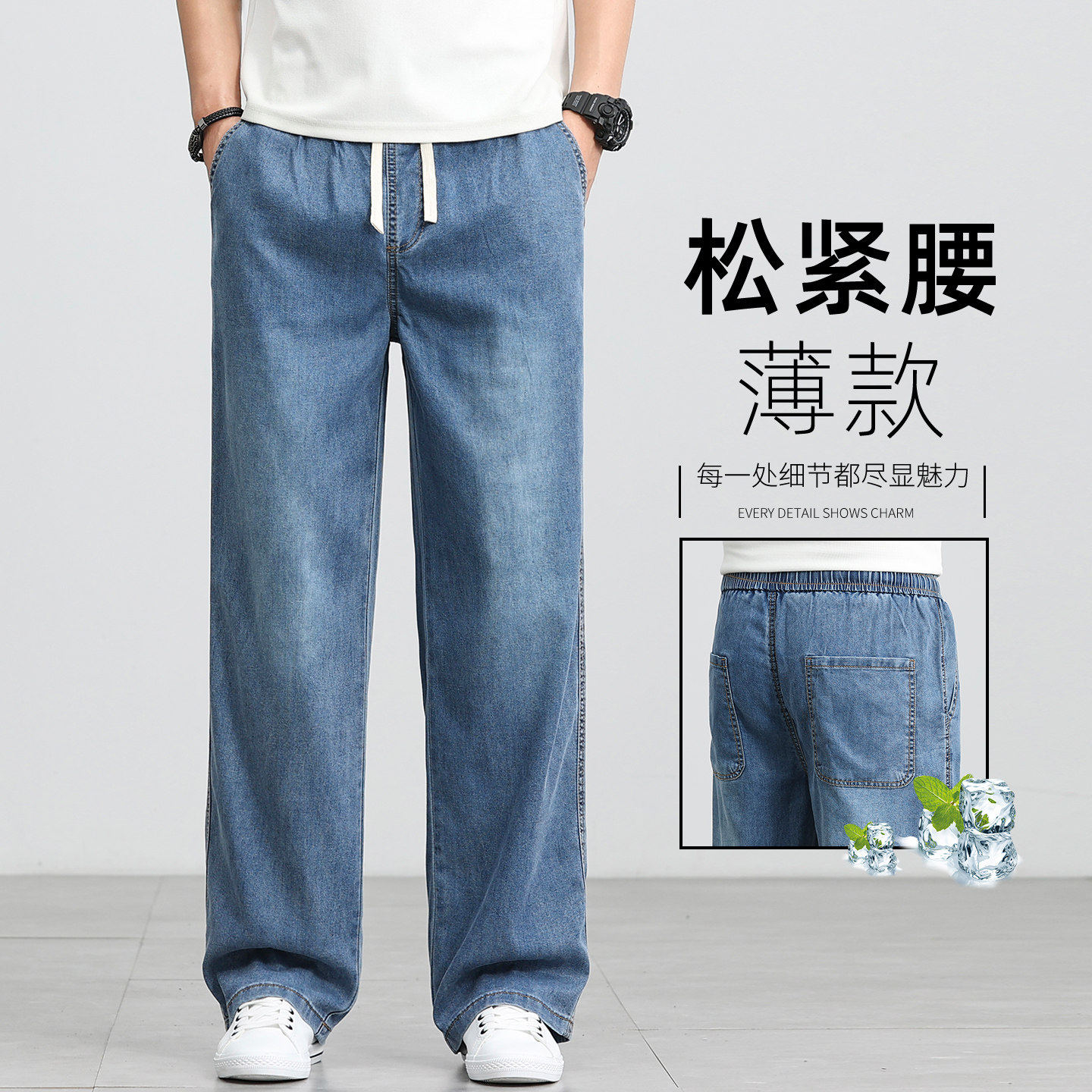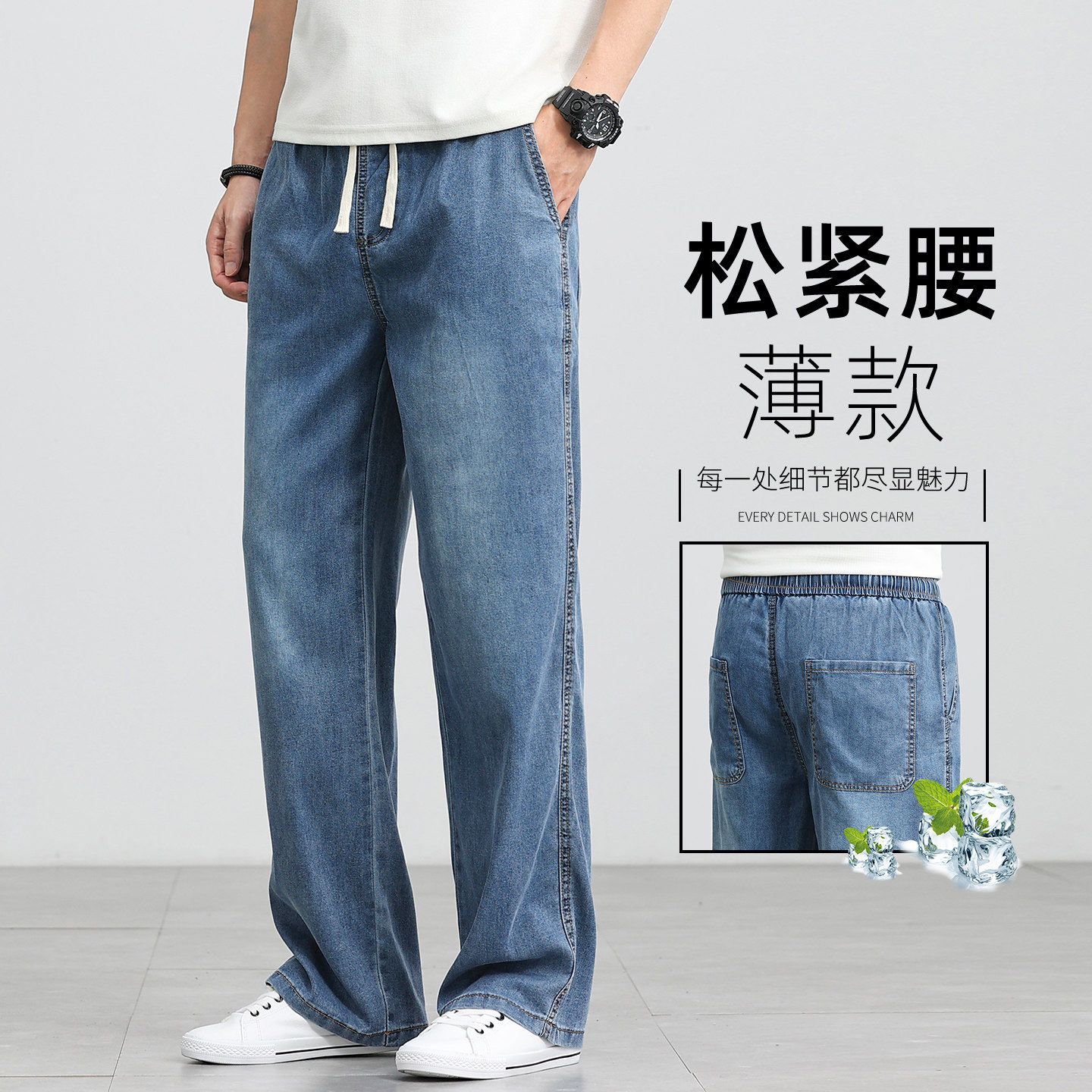 深蓝色松紧腰直筒宽松2026夏季新款牛仔裤男冰丝莱赛尔天丝男裤子