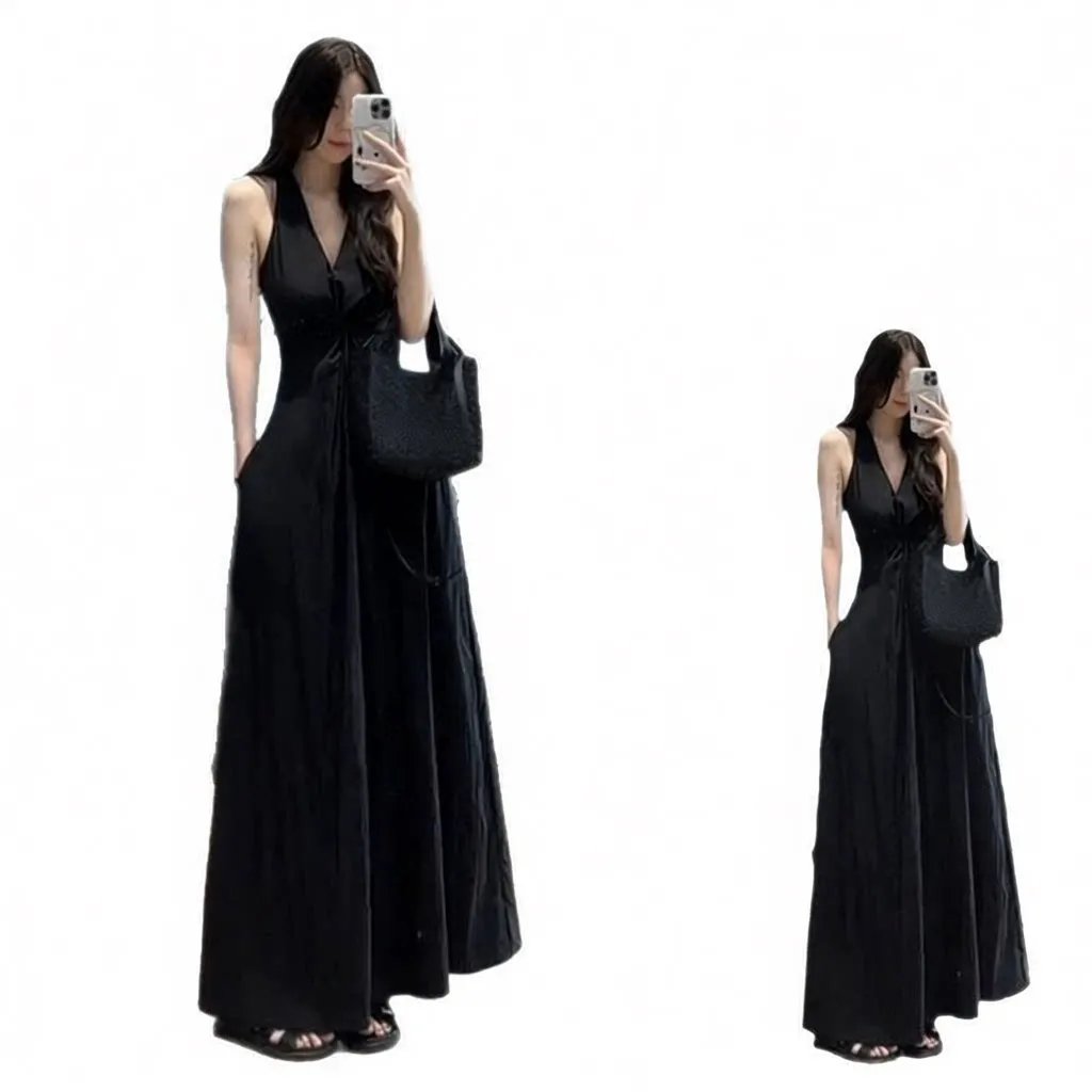 轻奢高级感黑色吊带挂脖连衣裙子女夏季2025新款气质超长裙到脚踝