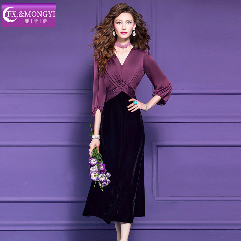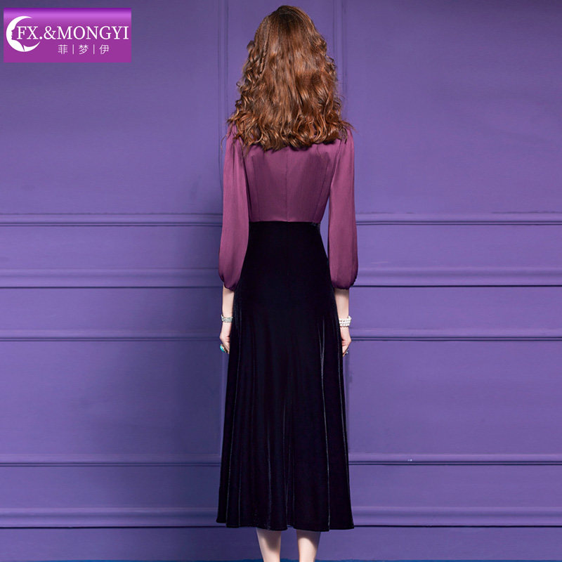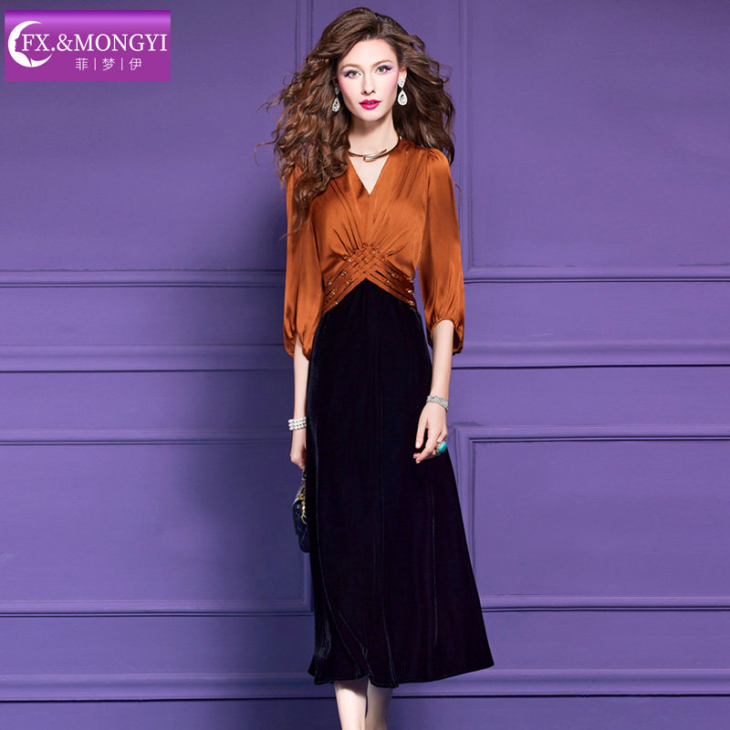 菲梦伊钉珠假两件连衣裙女长袖春装法式高级感收腰撞色V领中长裙