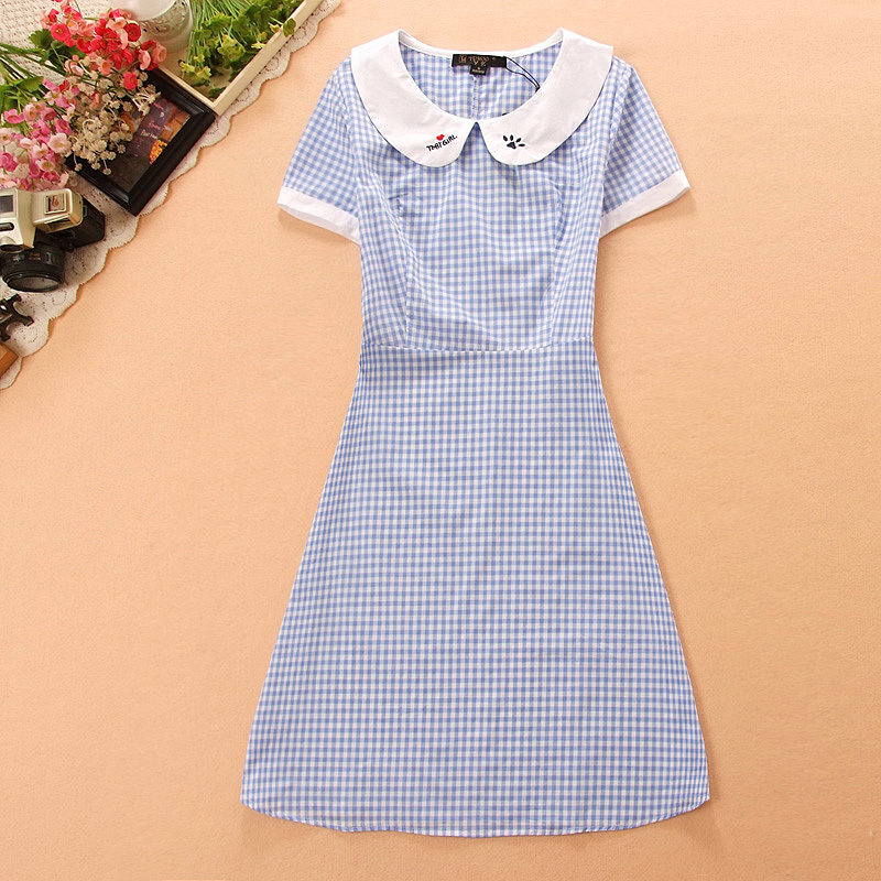 特价少女学生装女孩简单款经典复古小格子短袖连衣裙中长修身显瘦
