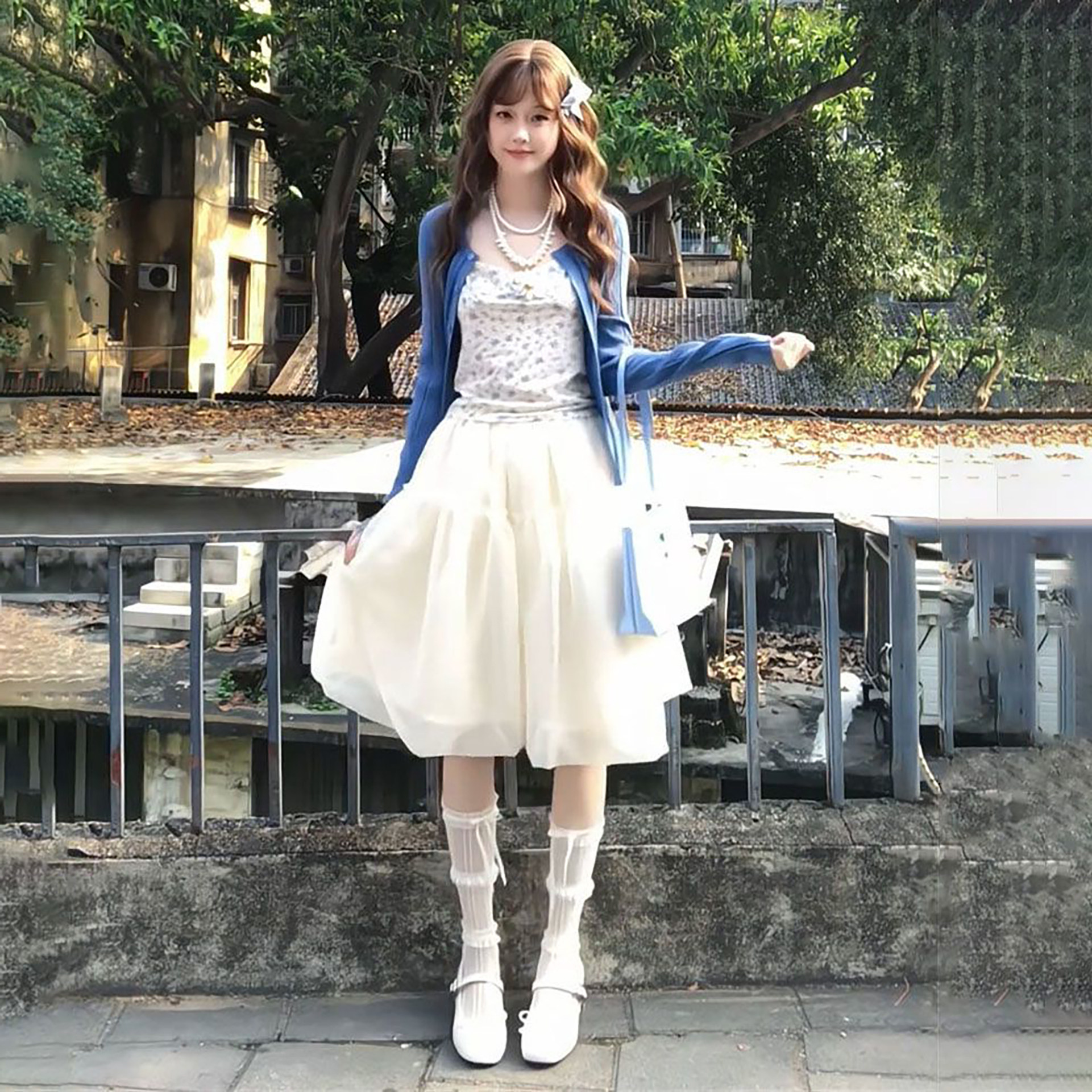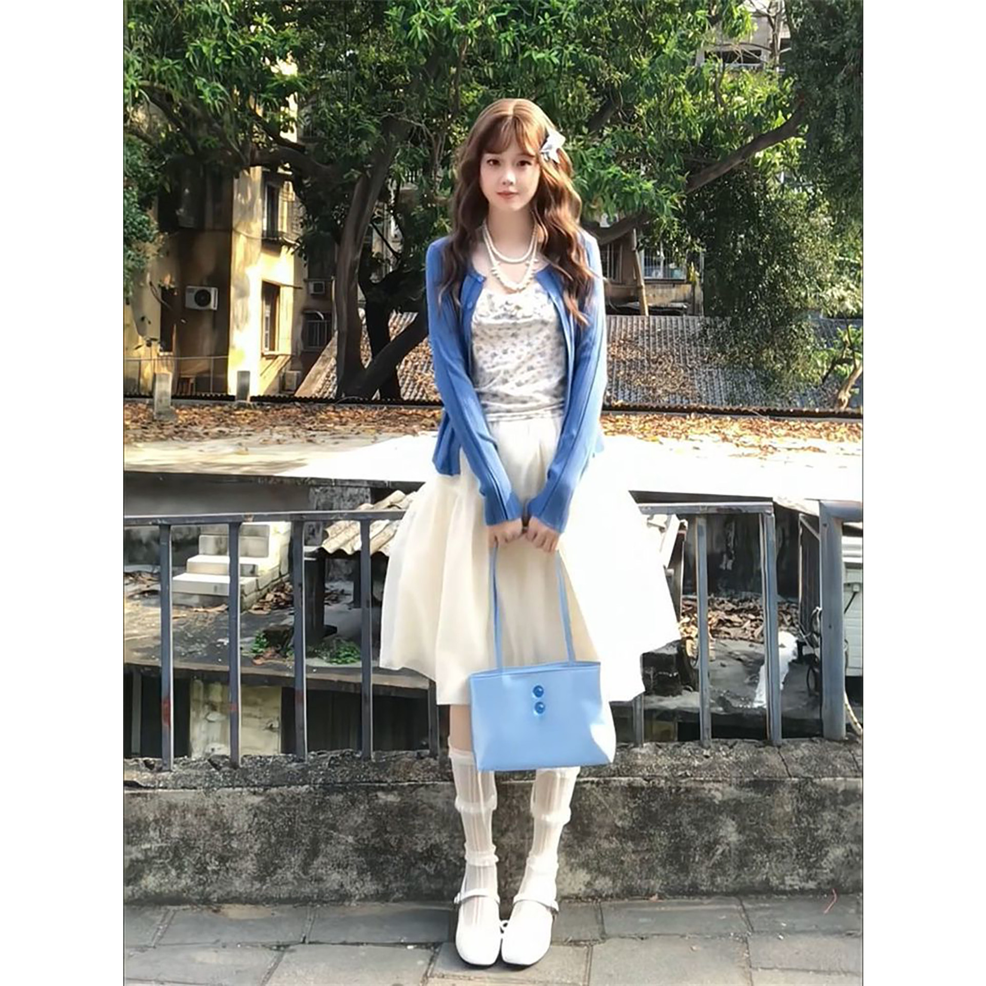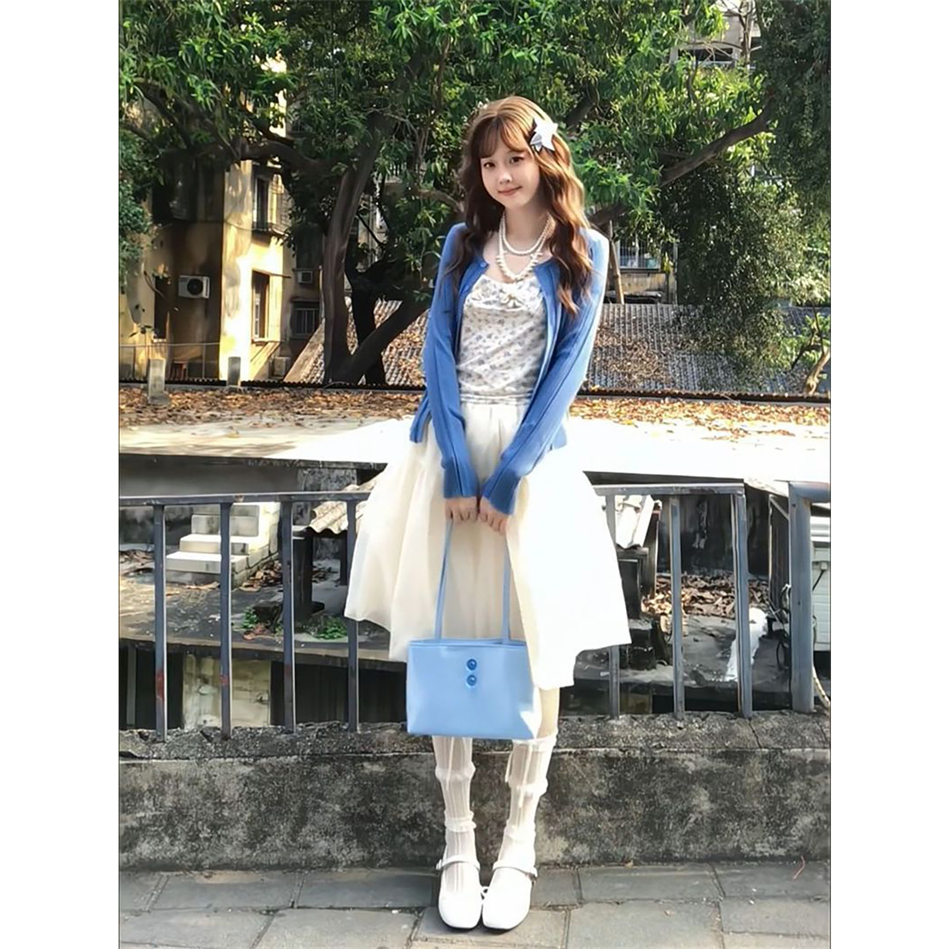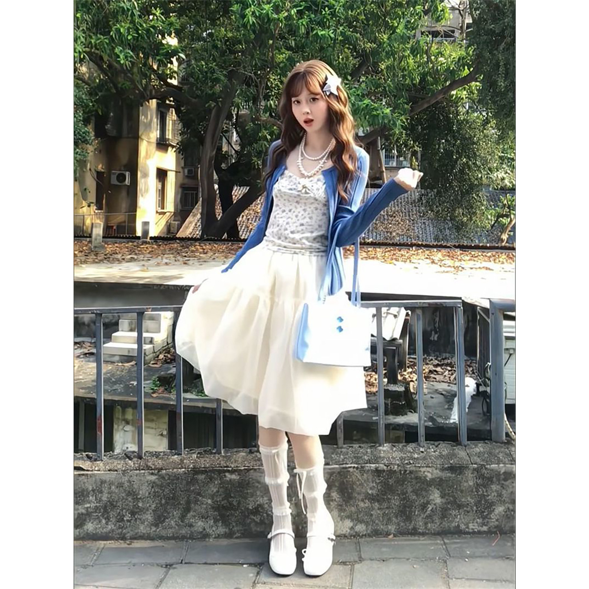 新款温柔古早感少女感穿搭蓝色开衫+碎花吊带+花苞半身裙三件套装