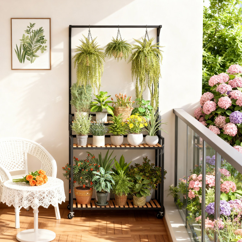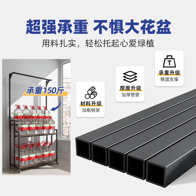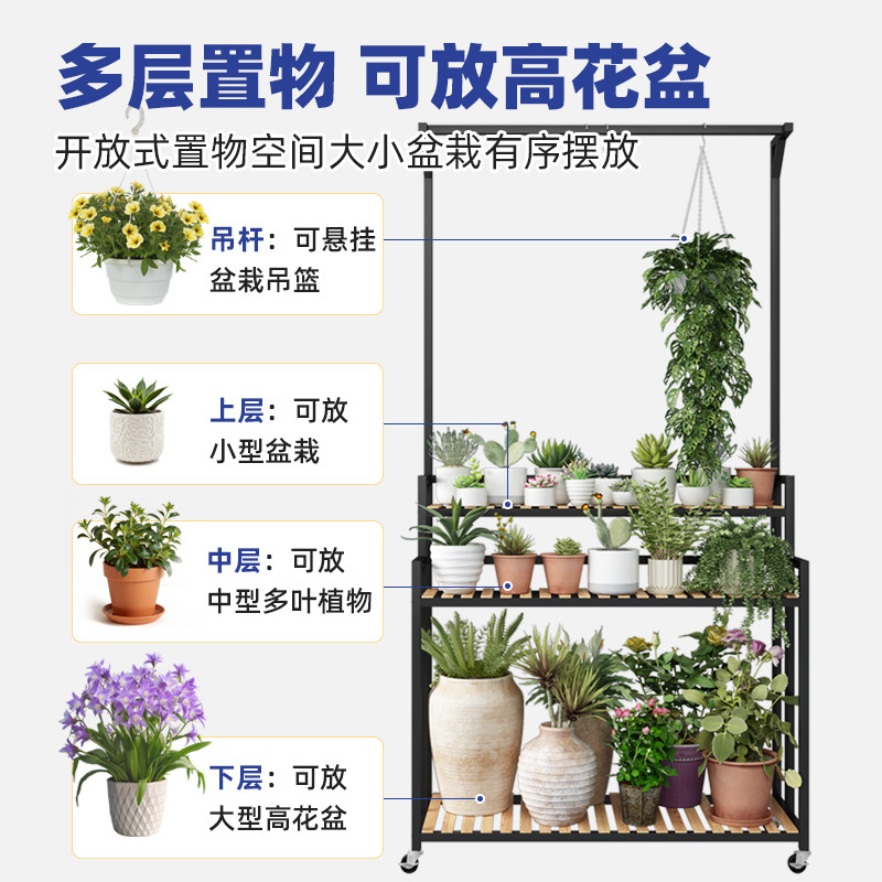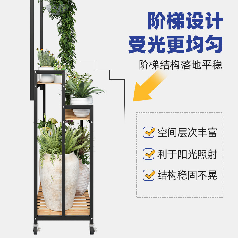 带轮阳台花架子客厅落地式可移动铁艺多肉花盆托架多层实木置物架